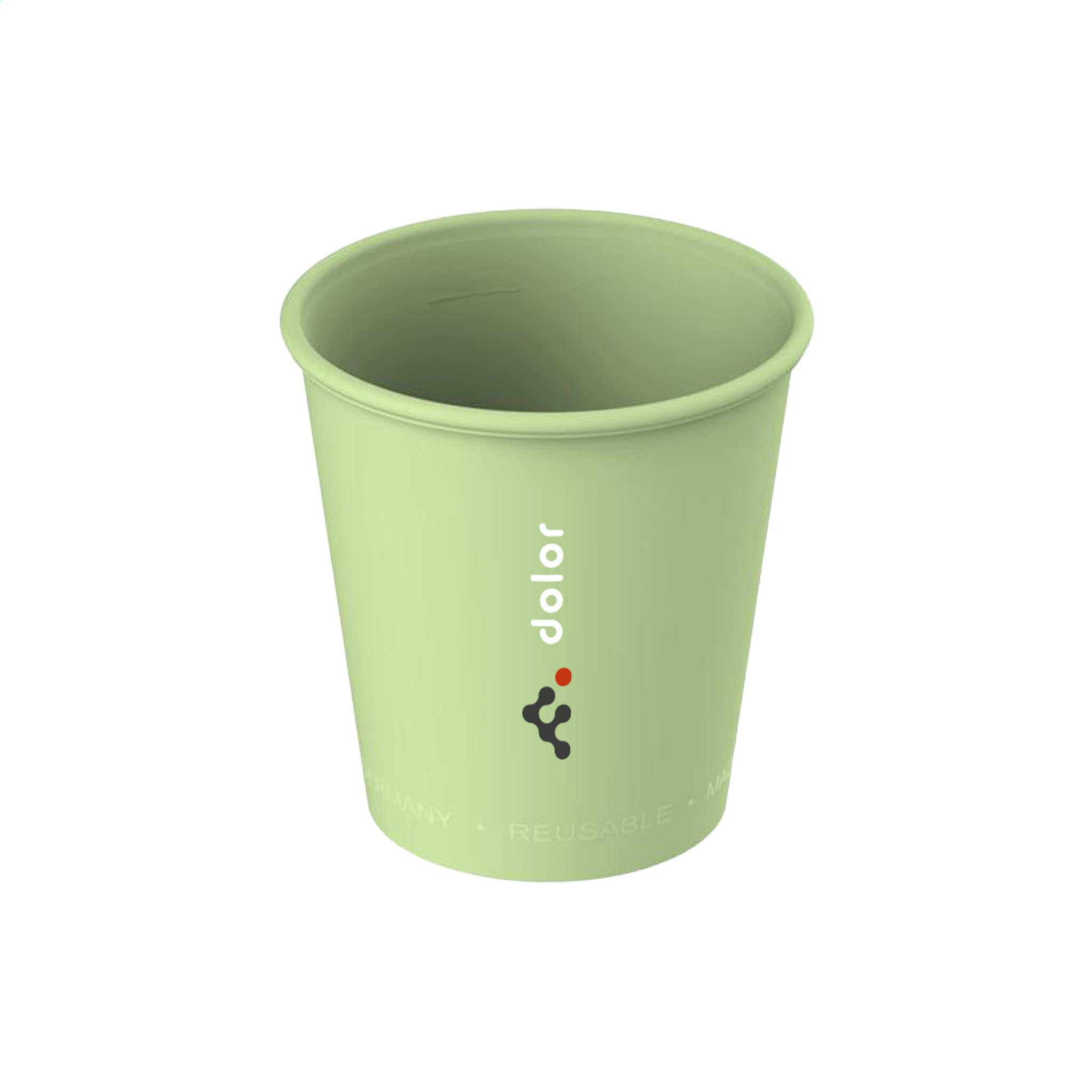 Uudelleenkäytettävä muovista valmistettu juomakuppi. Erinomainen käytettäväksi tavallisena uudelleenkäytettävänä kupina kahvinkeittimen kanssa. Täydellinen vaihtoehto kertakäyttöiselle kahvikupille. Kun vaihdat uudelleen käytettävään kuppiin, miljardeja vähemmän kuppeja päätyy jätteeseen. Tämä kaunis kuppi on 100 % kierrätettävä, BPA-vapaa ja pinottava. Tilavuus 200 ml. Valmistettu Saksassa. Minimitilaus 100 kpl per väri.