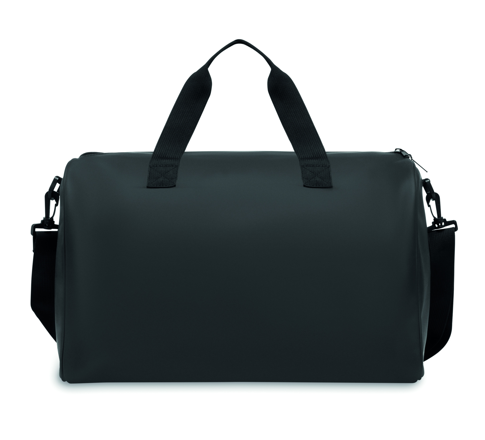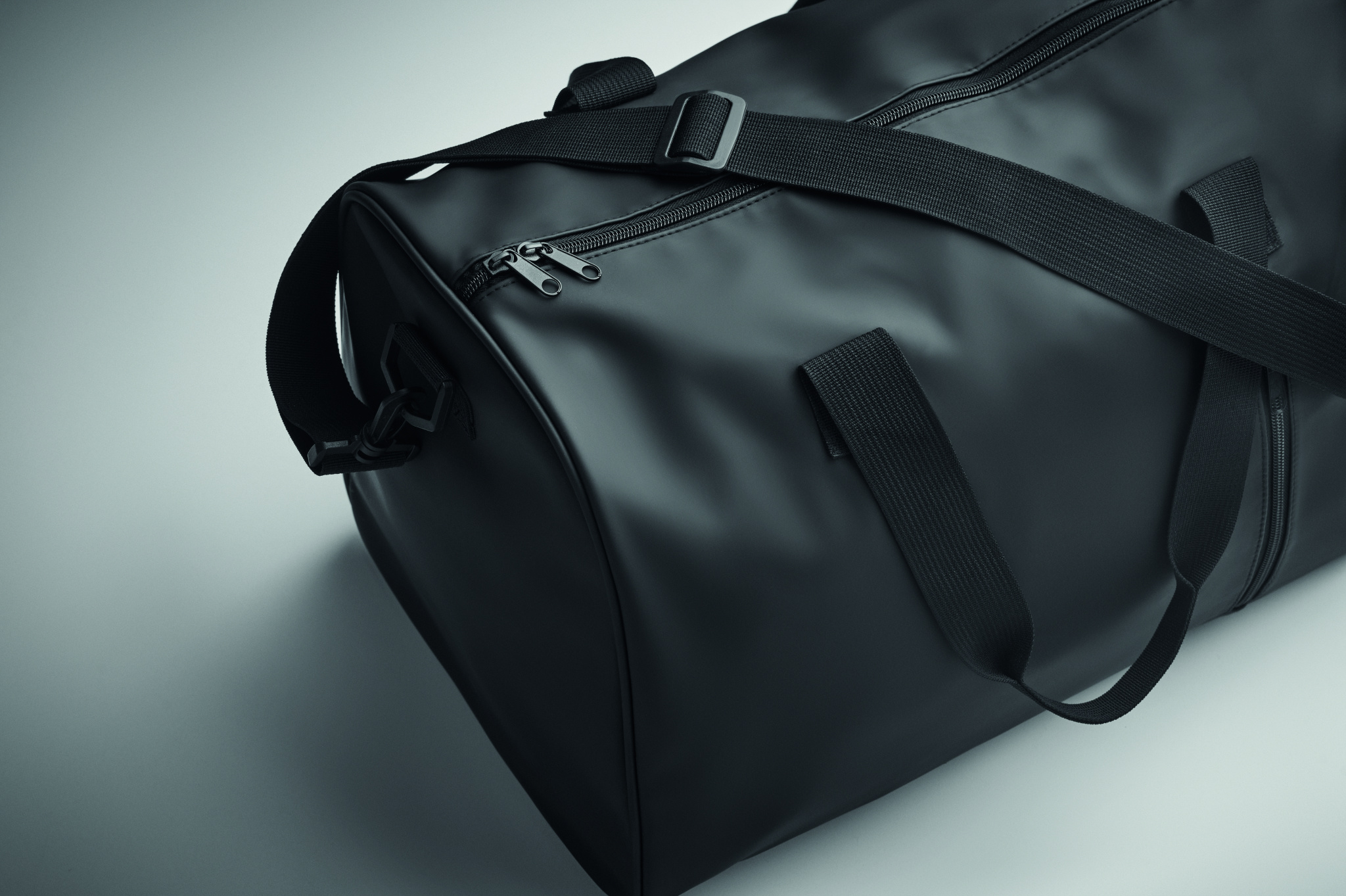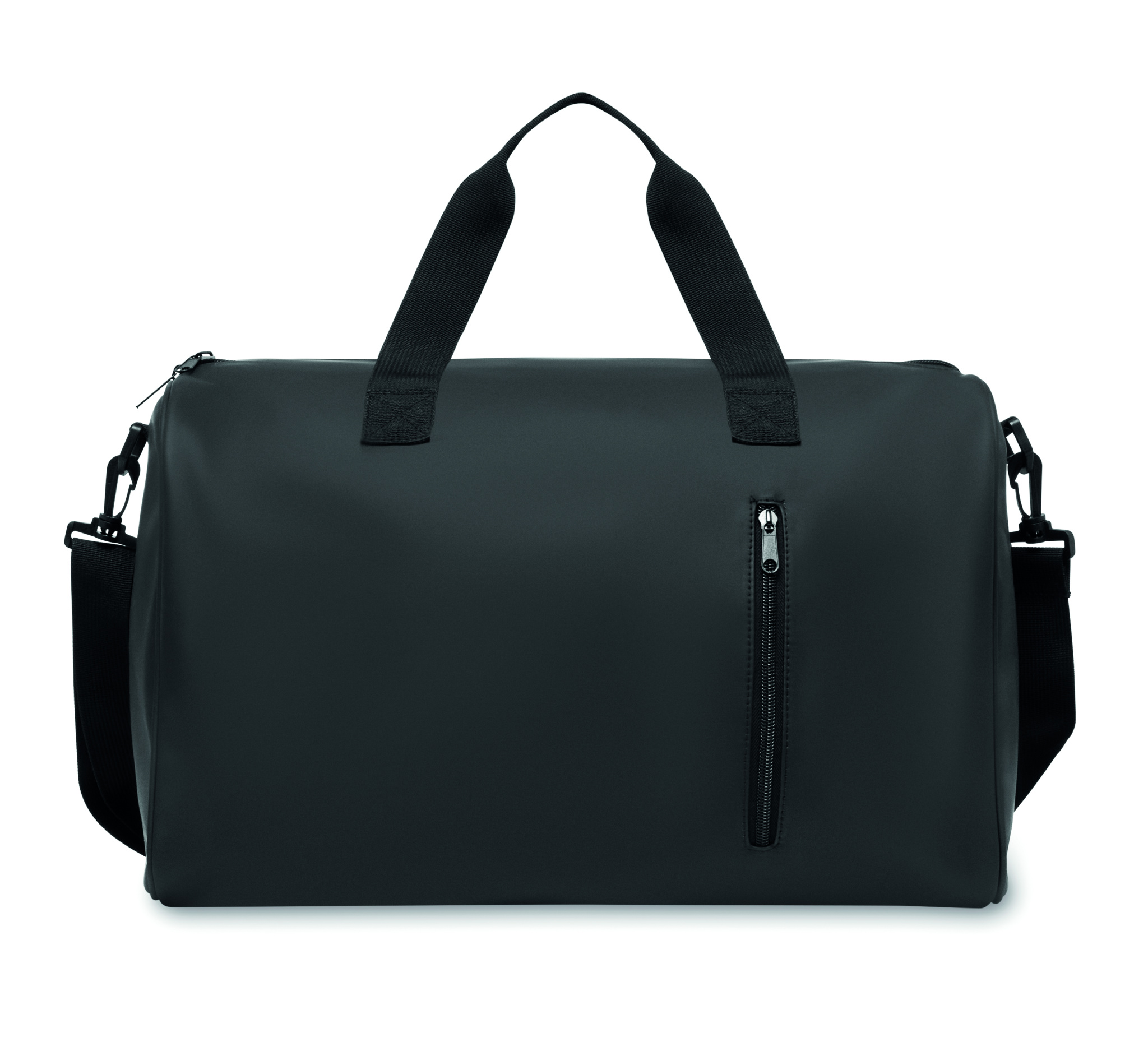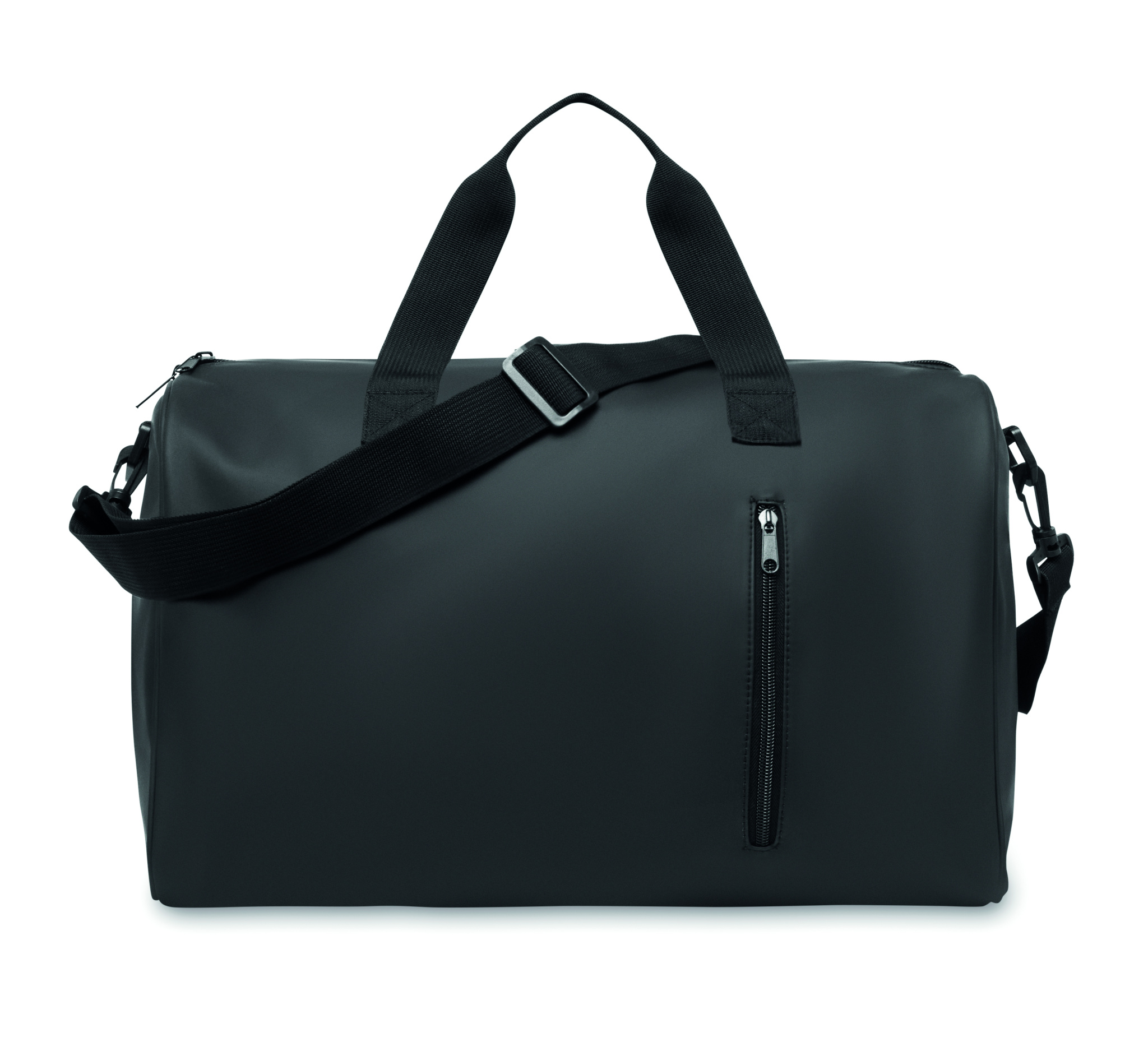 Duffle laukku pehmeää PU:ta, jossa vaahtomuovivahvike pohjassa. Yksi päätasku, vetoketjullinen etutasku. 210D RPET polyesterivuori. 2 kahvaa ja yksi säädettävä ja irrotettava olkahihna