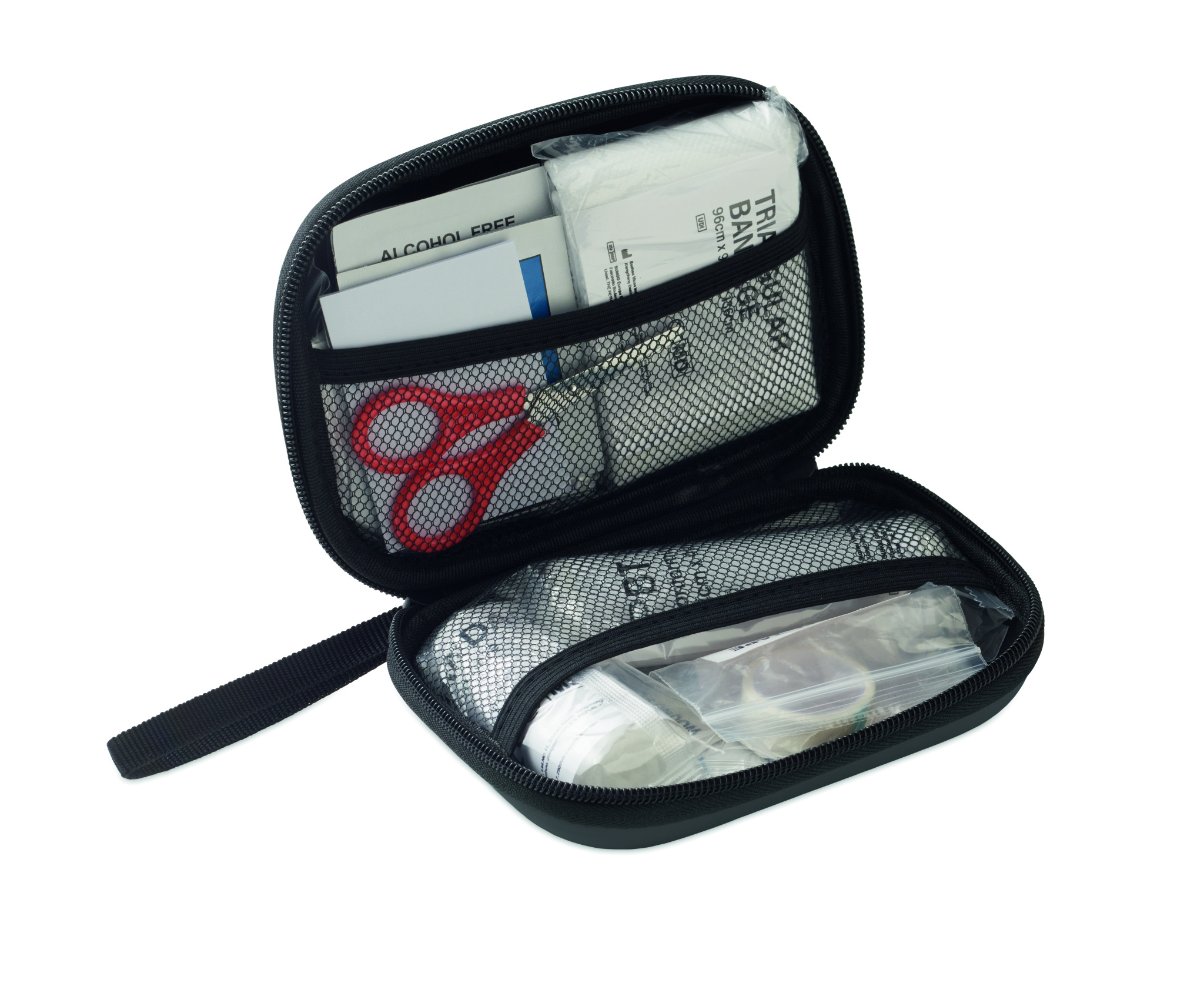 Ensiapulaukku kovassa PU-kotelossa. Sisältää 2 käsinettä, 1 peiton, 1 teipin, 2 sidettä, 1 sakset, 4 vanupuikkoa, 10 laastaria ja 6 puhdistusliinaa. Ei saatavilla EU:n ulkopuolelle.