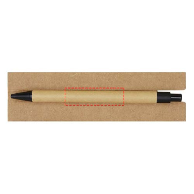 Tarralehtiö kuulakärkikynällä. Muistilehtiössä on 30 arkkia valkoista 70 g/m2 viivapaperia (8 x 12 cm). Siinä on myös 25 moniväristä (5 x 1,2 cm) ja 25 keltaista (7,5 x 7,5 cm) tarralappua. Paperi 70 g/m2. Kuulakärkikynän runko on valmistettu kierrätyspaperista. Musteen väri: Musta. Kirjoituspituus: 1000 metriä. Kärjen paksuus: 1,00 mm.