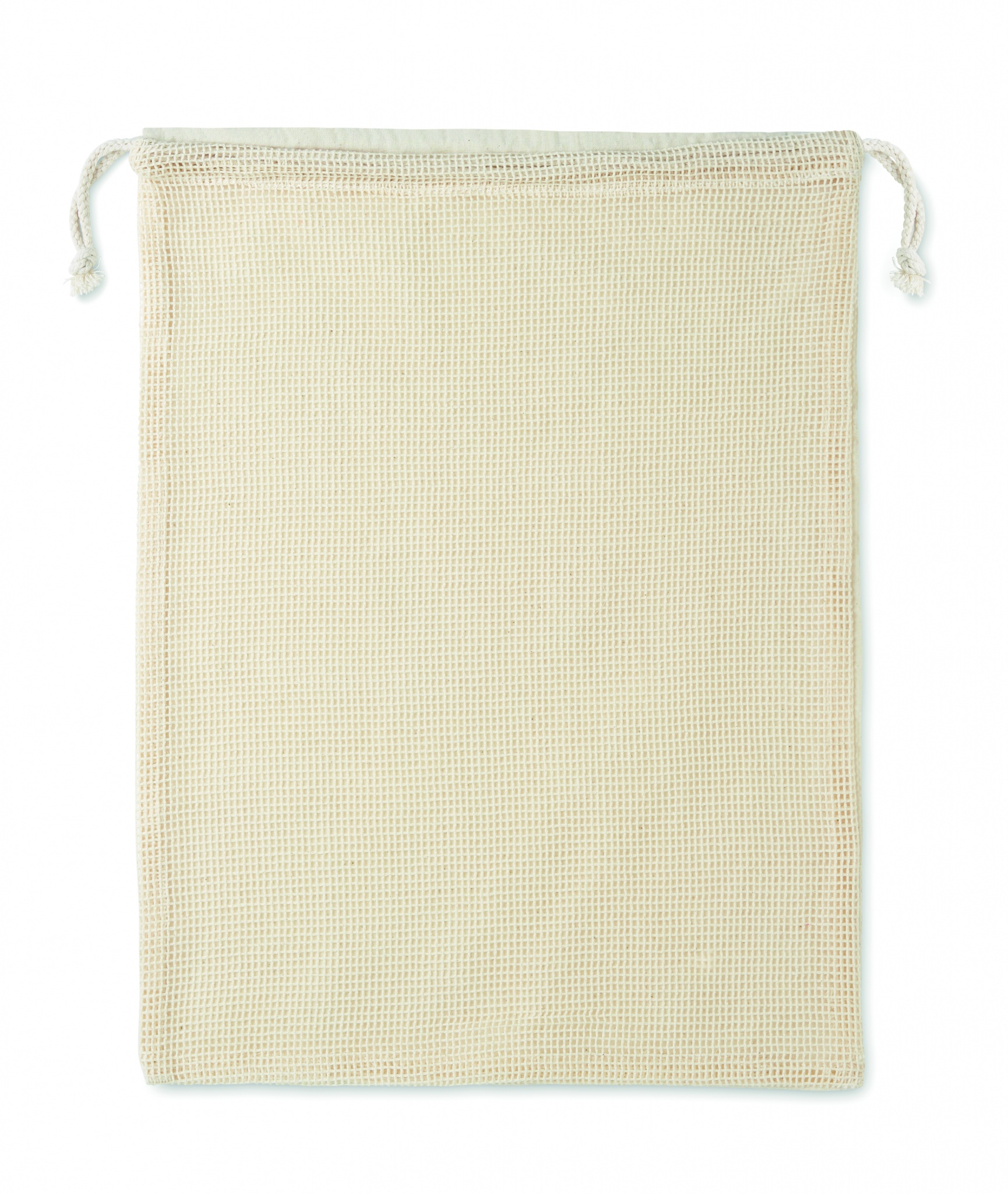 Uudelleen käytettävä hedelmäpussi, tuote on valmistettu 140gr/m² puuvillasta ja 110gr/m² puuvilla verkosta, nyöri kiinnityksellä.