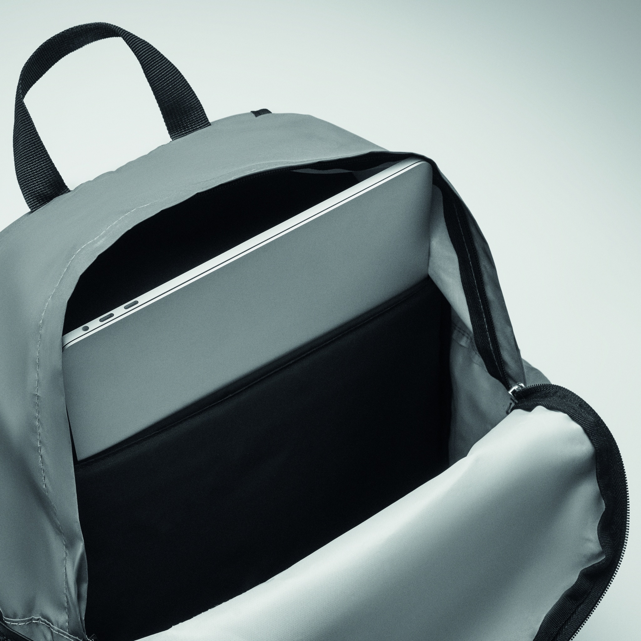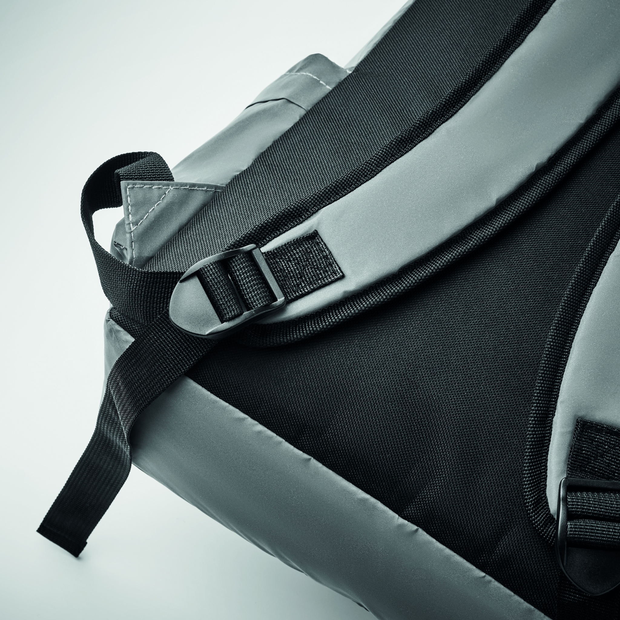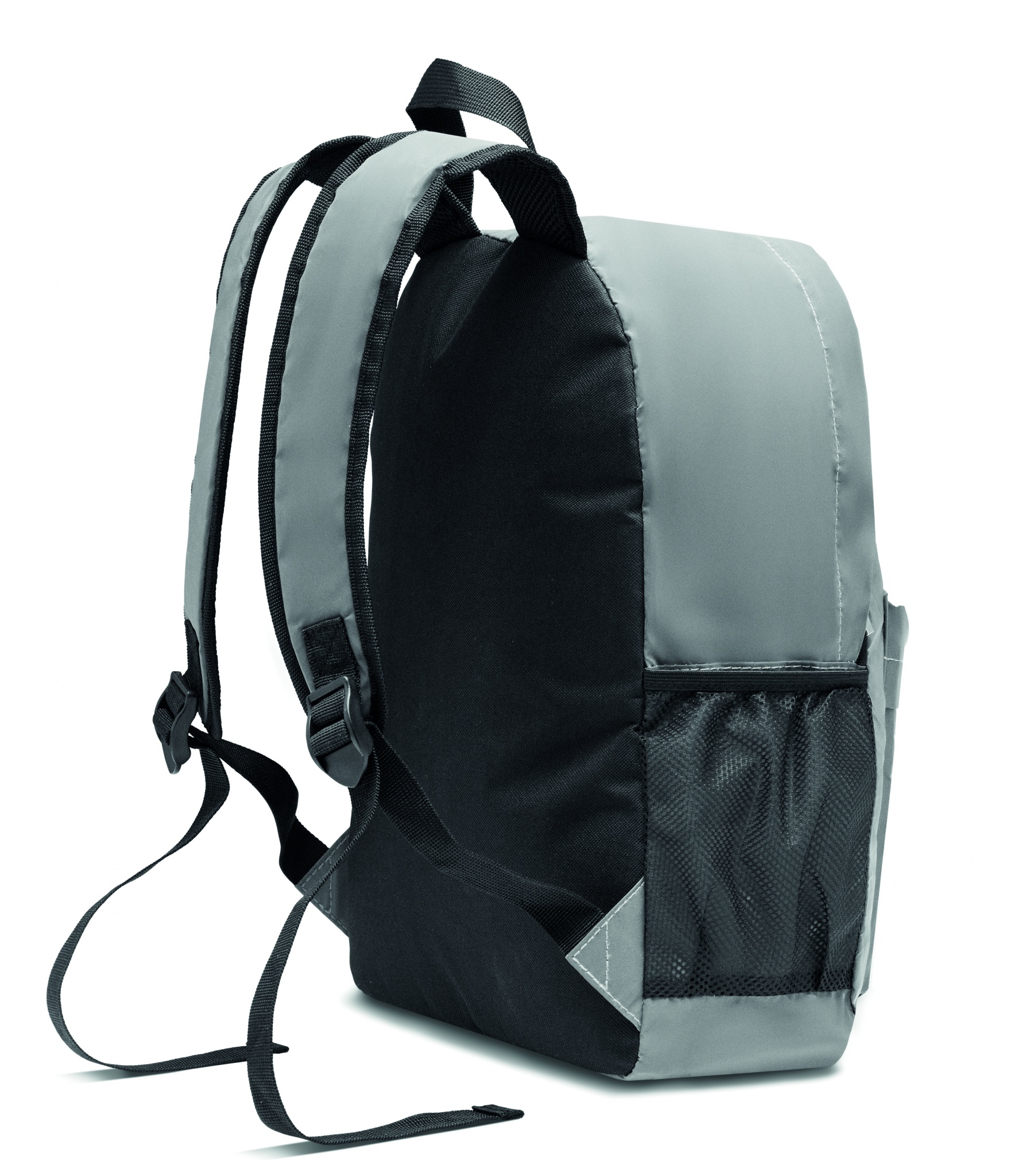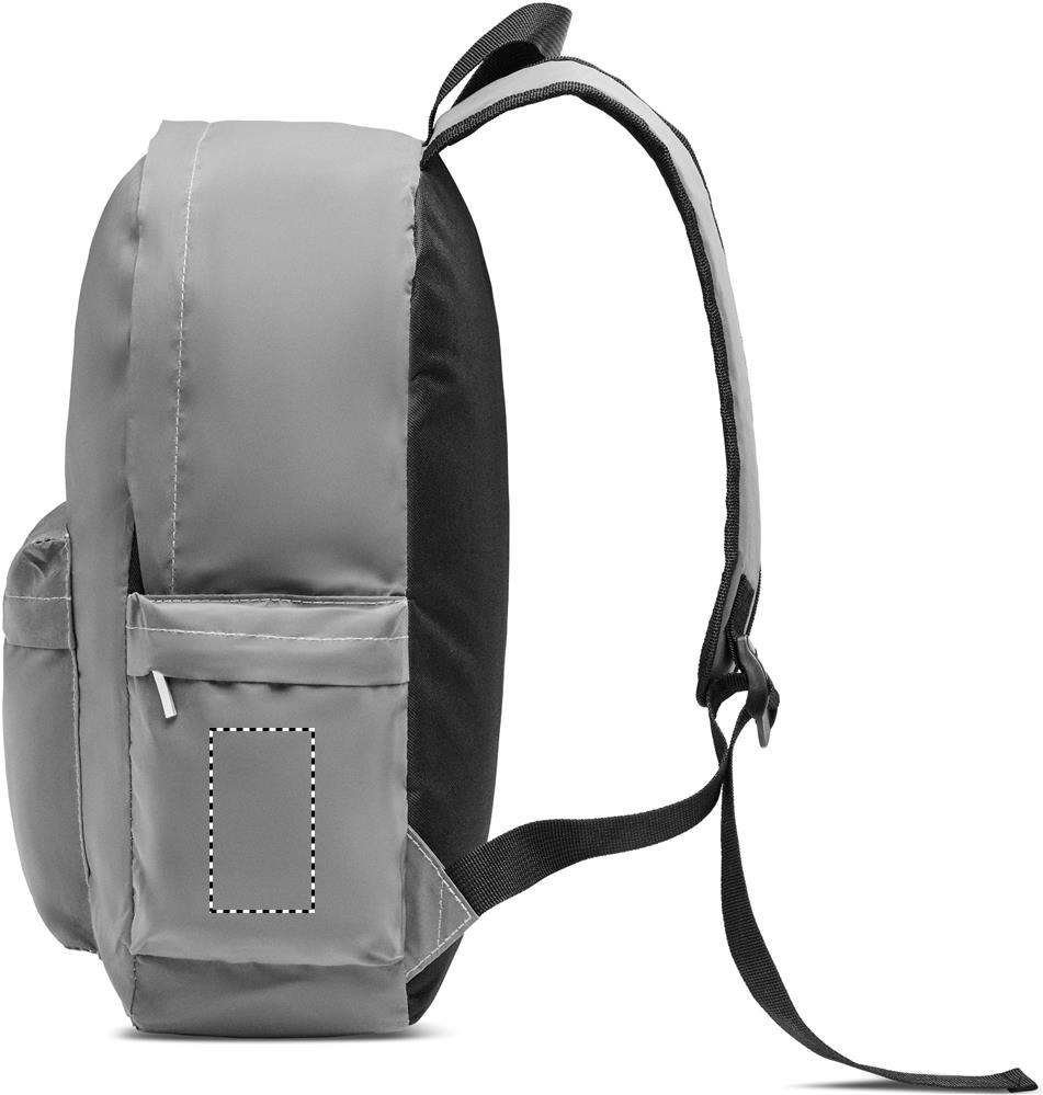 Reppu heijastavaa 190T polyesteriä. Pehmustettu selkäosa, hihnat ja pohja. Repussa on lokero 15'' kannettavalle tietokoneelle. Vetoketjullinen tasku edessä ja verkkotasku sivulla sekä muita vetoketjullisia taskuja sivulla.