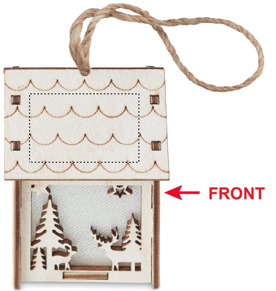 MDF valmistettu joulukoriste talo, sisällä valo ja talon katossa ripustuskoukku. 3 AG12 patteria sisältyy toimitukseen.