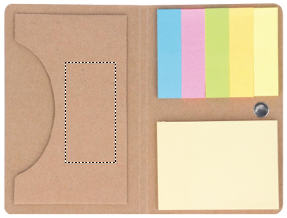 Voimapaperista valmistettu käyntikorttitasku, elastisella sulkuhihnalla. Sisältää keskikokoisen keltaisen muistilappulehtiön tarrapinnalla ja 5 eri väristä indeksi tarralappua.