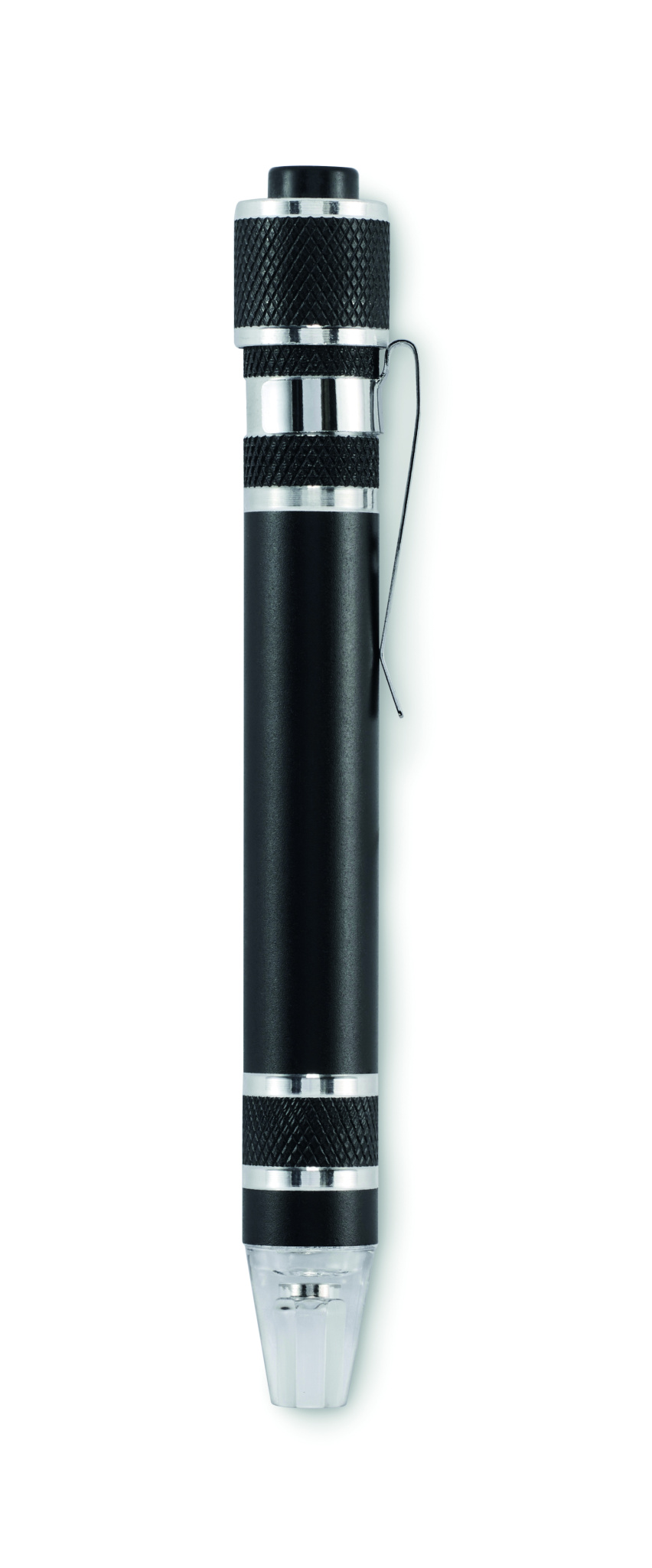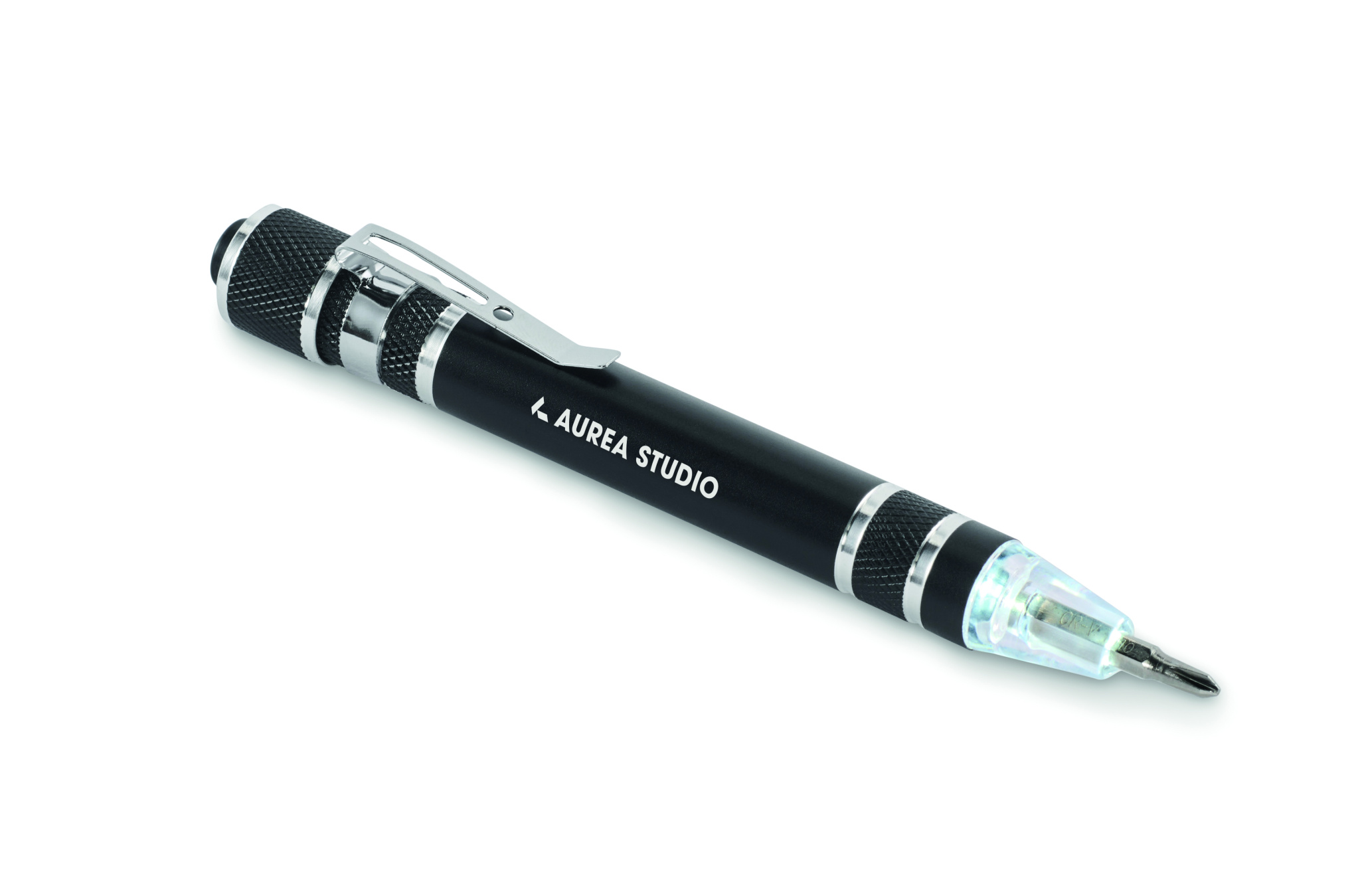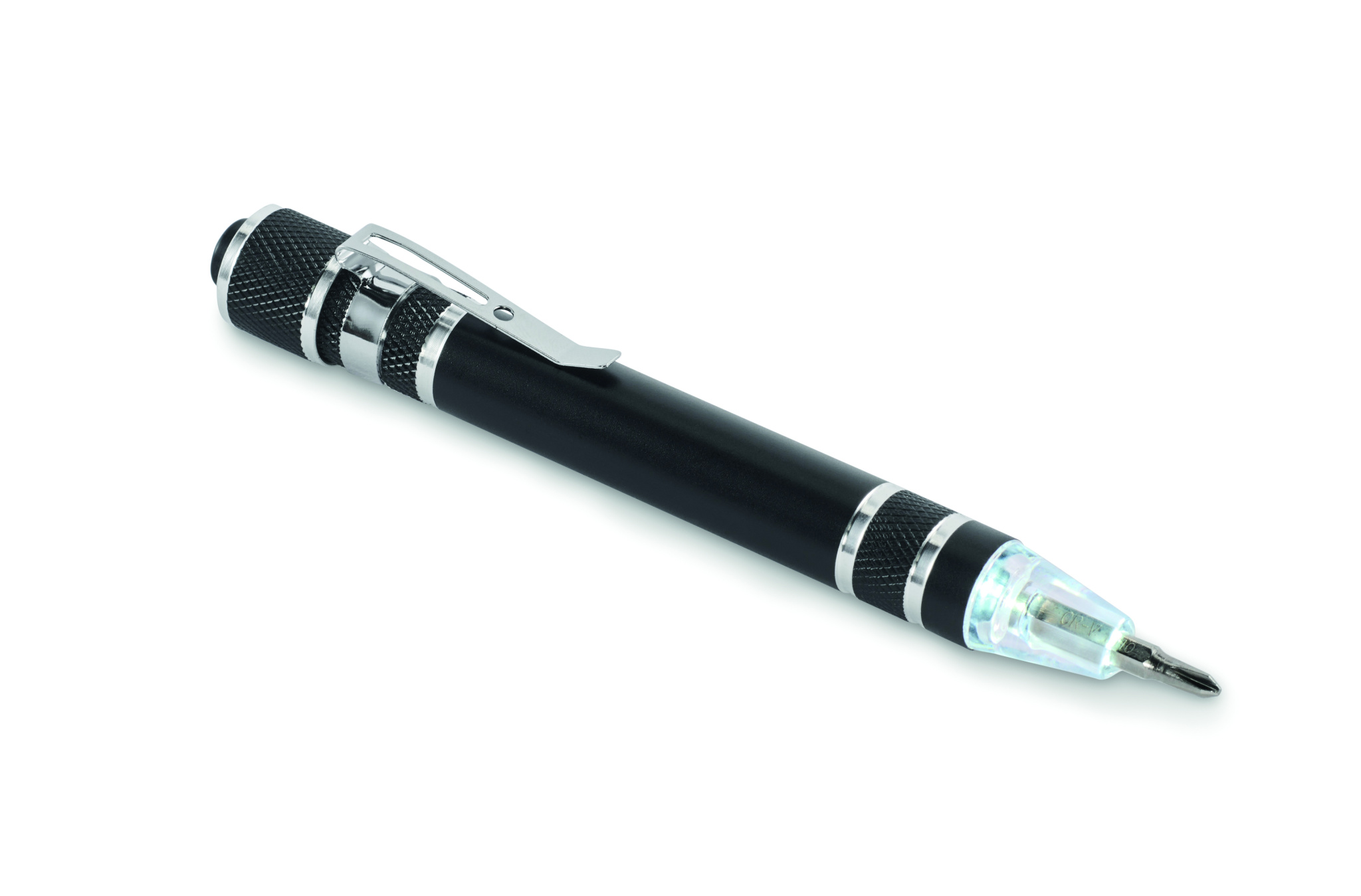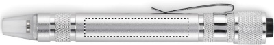 Kierrätetystä alumiinista valmistettu monitoimityökalu kynän muotoisella taskulampulla. Sisältää 3 uraa ja 3 ristipääruuvitaltan päätä. Mukana 4 nappiparistoa LR41.