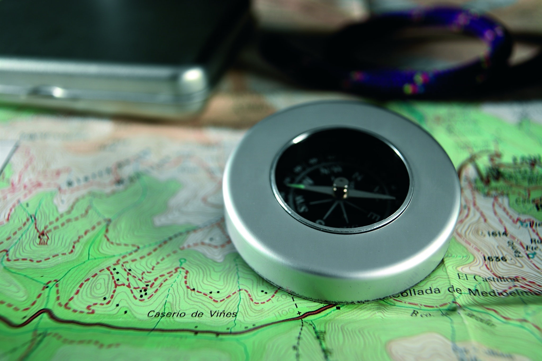 Alumiininen kompassi, pakattuna tinarasiaan.