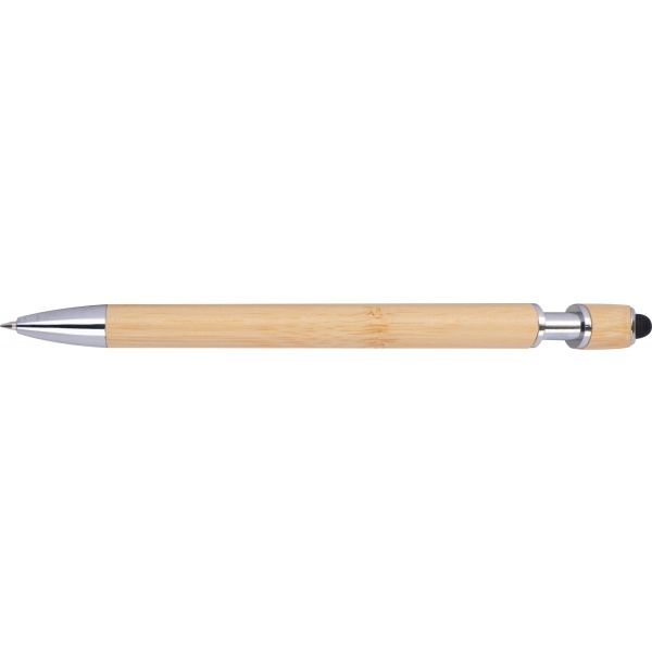 Bambu kuulakärkikynä kosketuskynällä. Kuulakärkikynässä on hopeanväriset muovikorosteet, metallipidike ja sinikirjoitusmuovinen jumbo-täyttö.