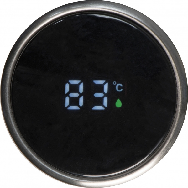 Borosilikaattilasista valmistettu lämpöpullo, jossa digitaalinen lämpötilanäyttö kannessa, seula ja tilavuus 400 ml. Logosi painetaan lasille.