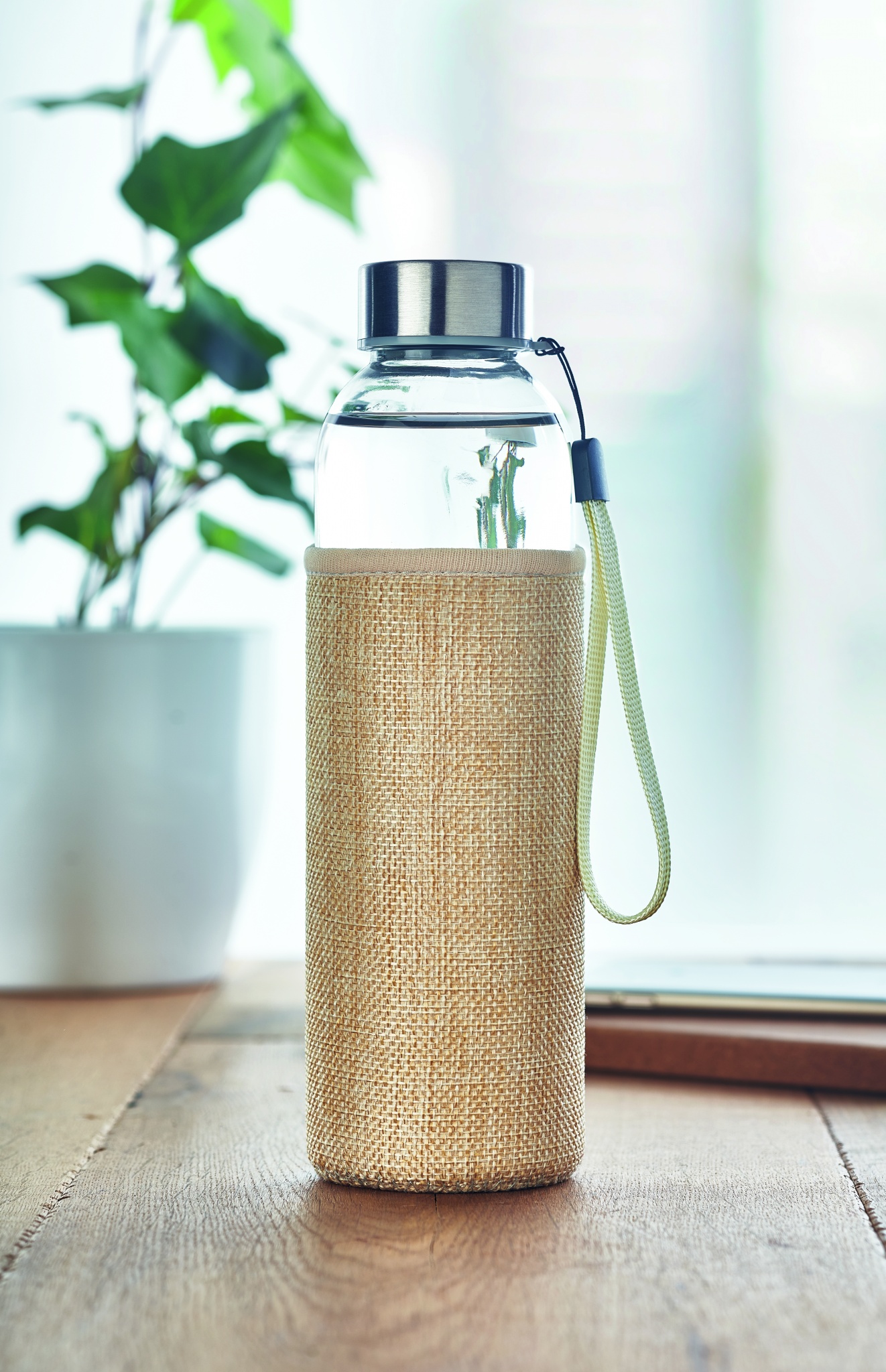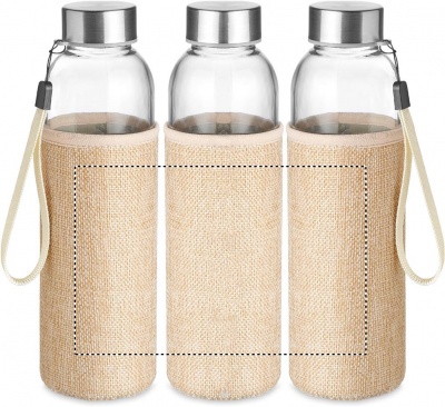 500ml lasinen juomapullo, neonpreenityylisessä juuttisekoituspussissa. Tuote ei sovellu käytettäväksi hiilihapollisilla nesteille.