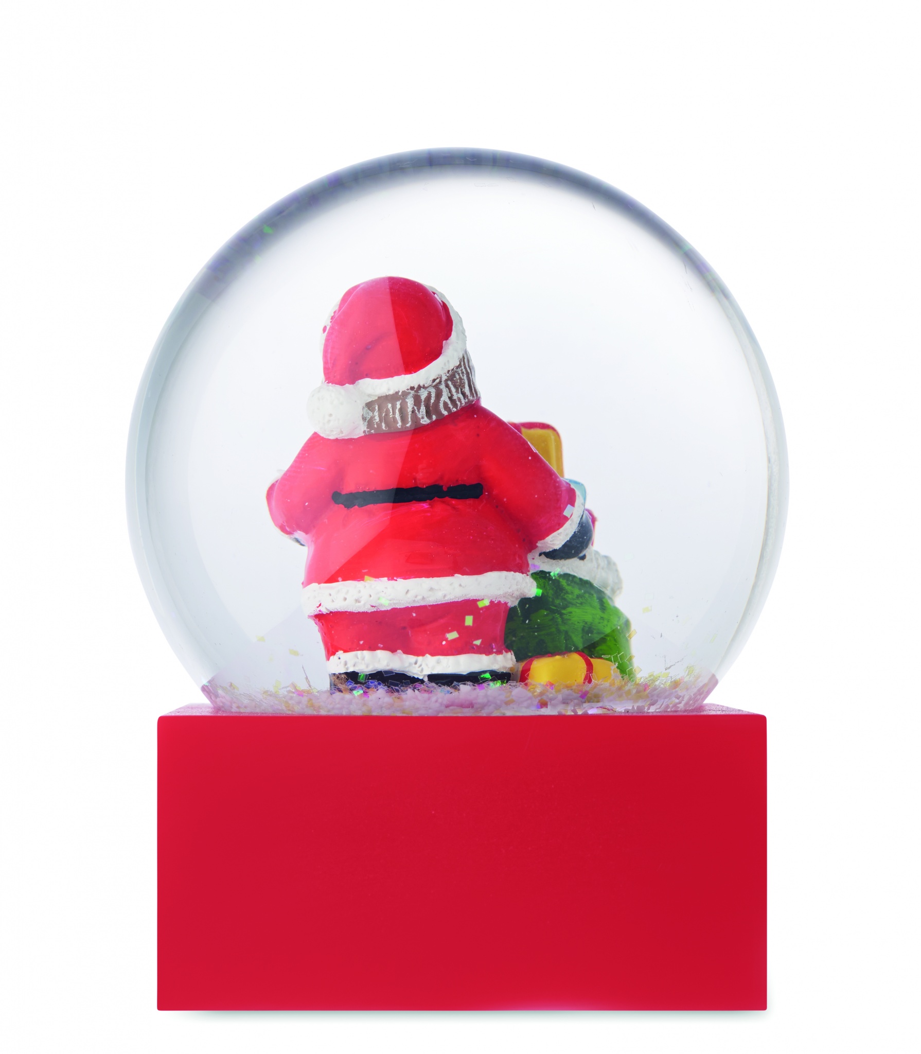 Jouluinen lasinen lumipallokoriste, jossa on polyresiinipohja.
