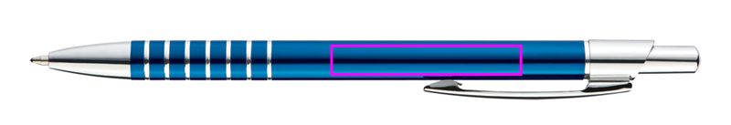 Ohut metallikuulakynä, jossa sinikirjoitustäyttö ja kaiverrettu otealue. Kaivertamme logosi klipsien alle.