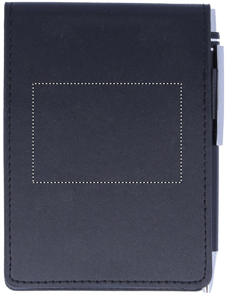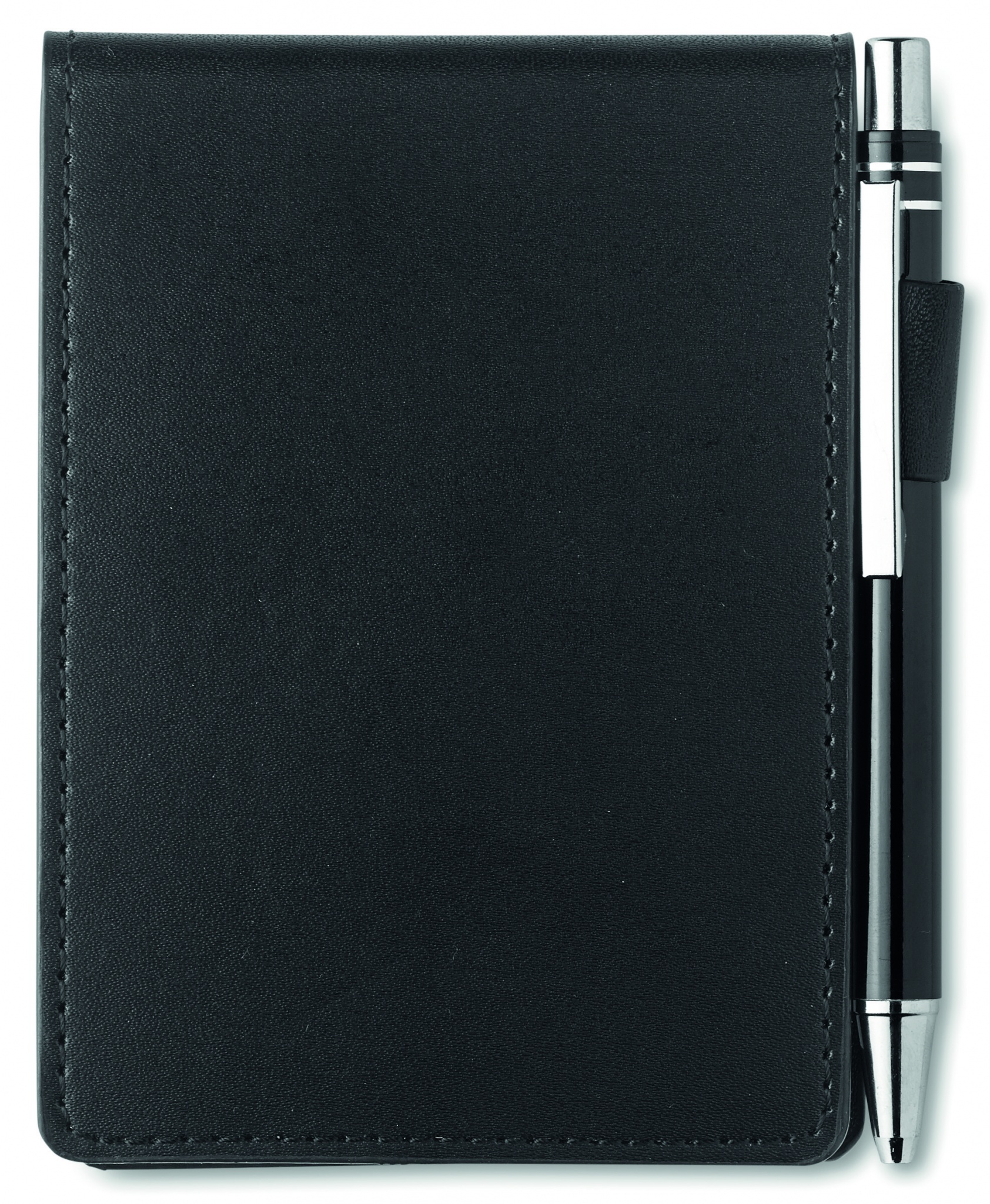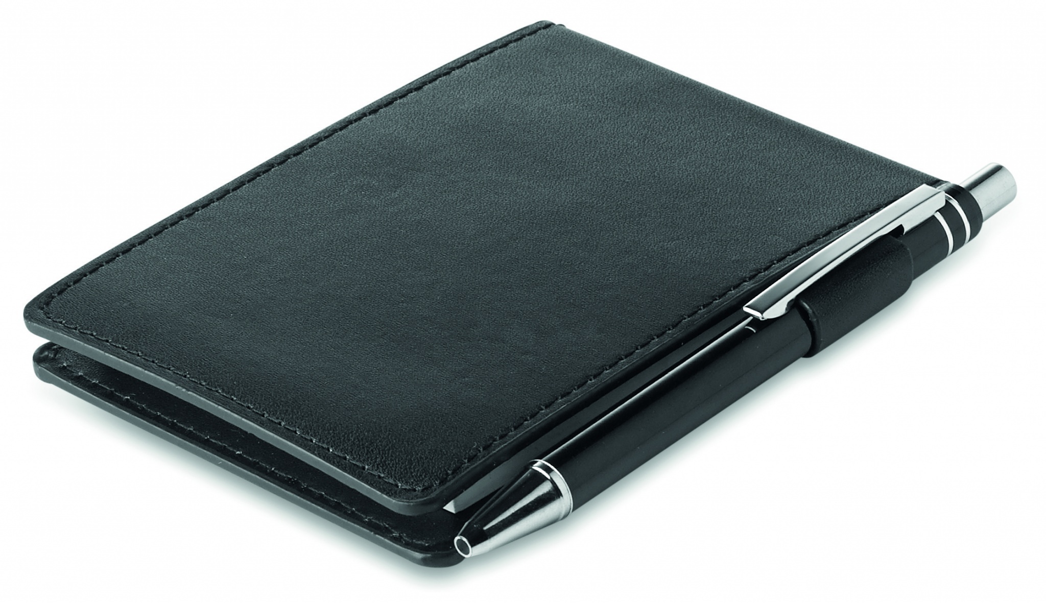 A7 muistilehtiö PU kuorella ja kynäsilmukalla, sisältää 60 tyhjää esirei'itettyä sivua ja yhteensopivan kuulakärkikynän sinisellä musteella.