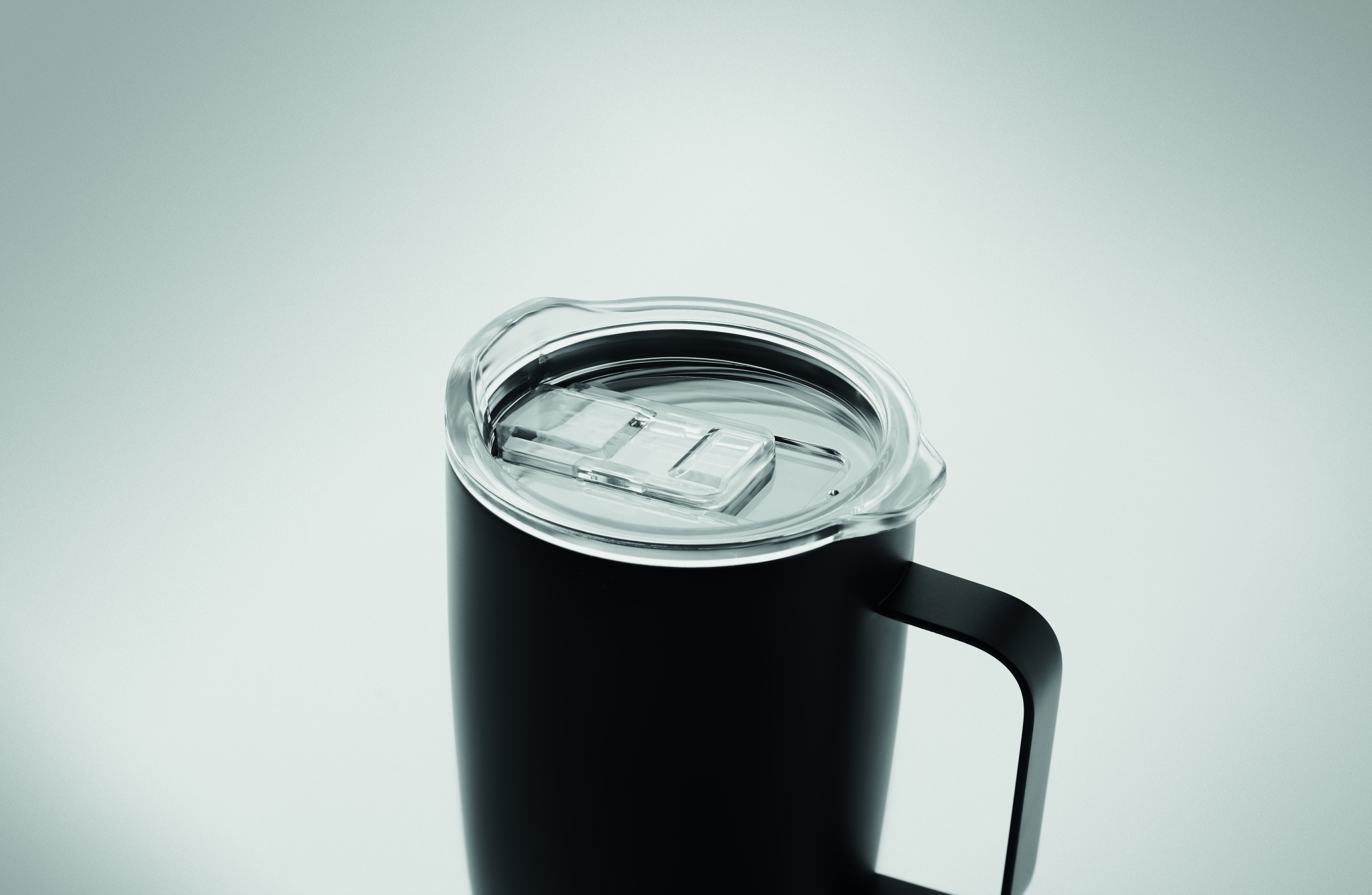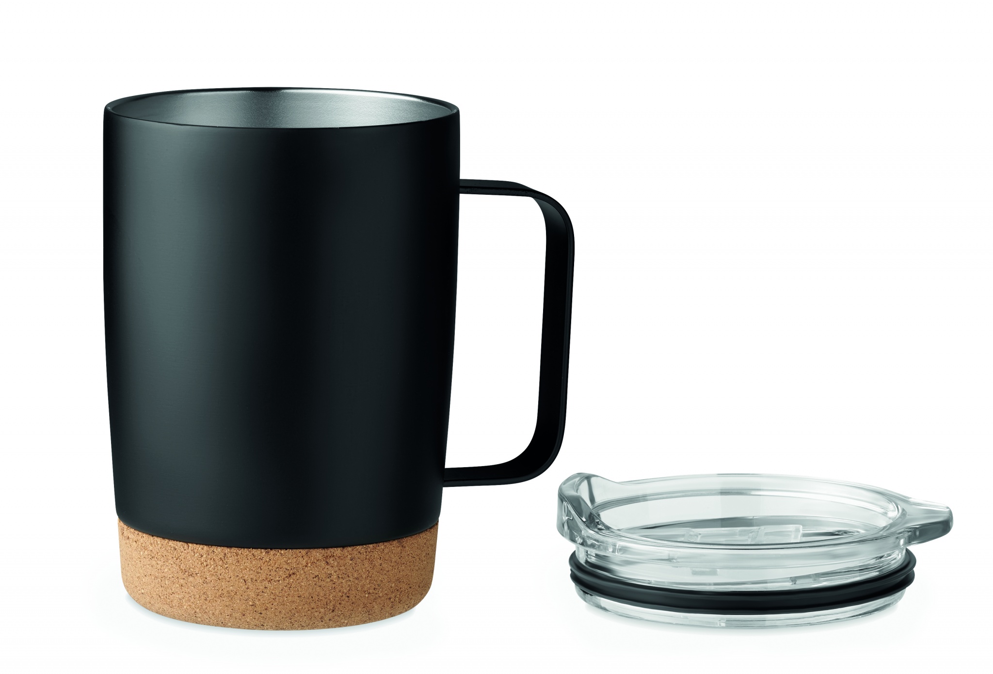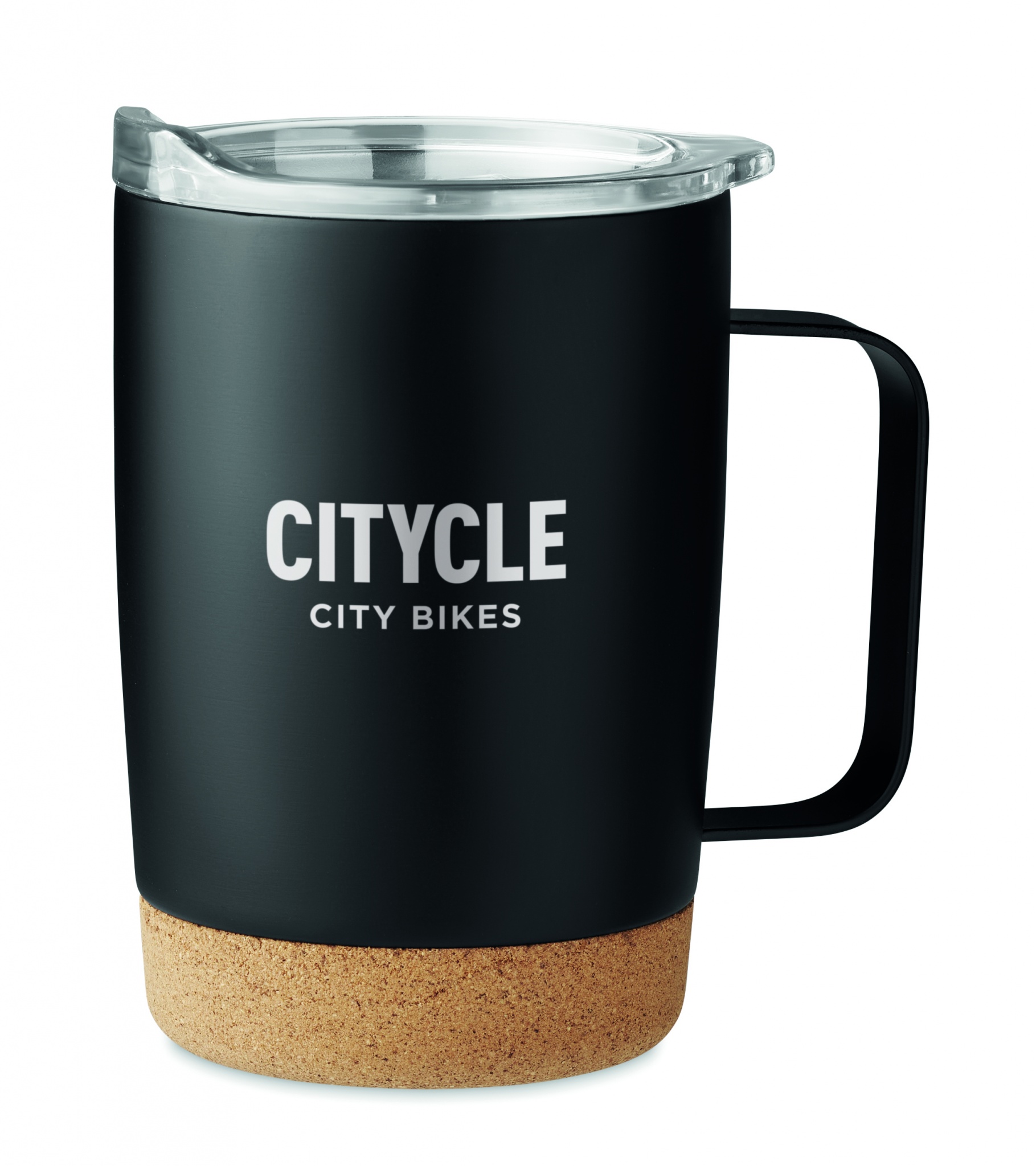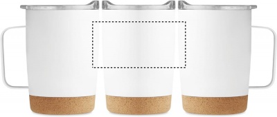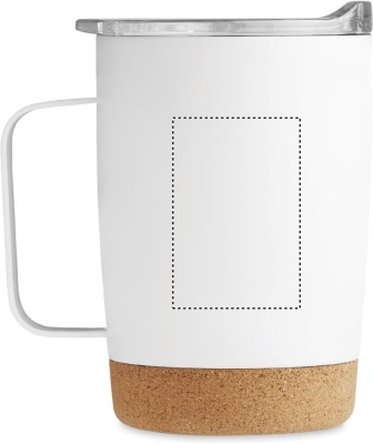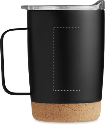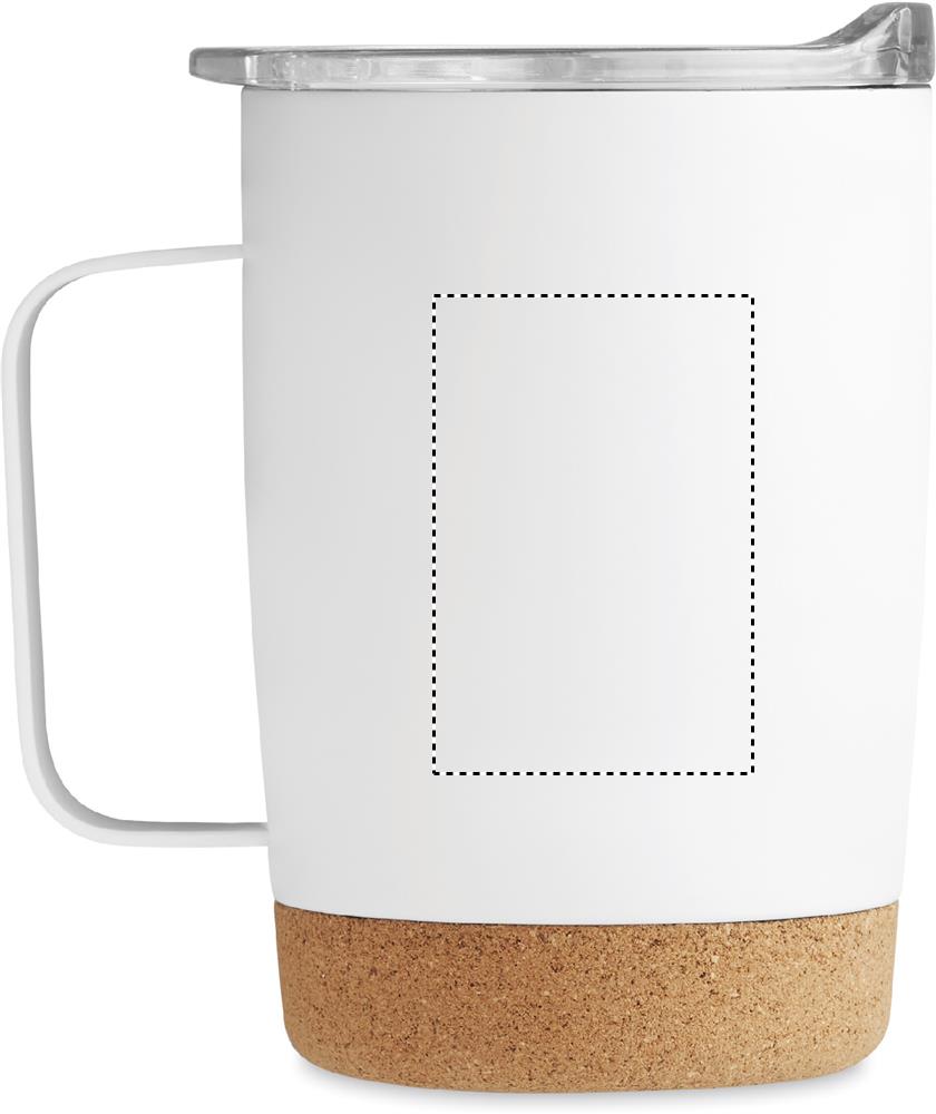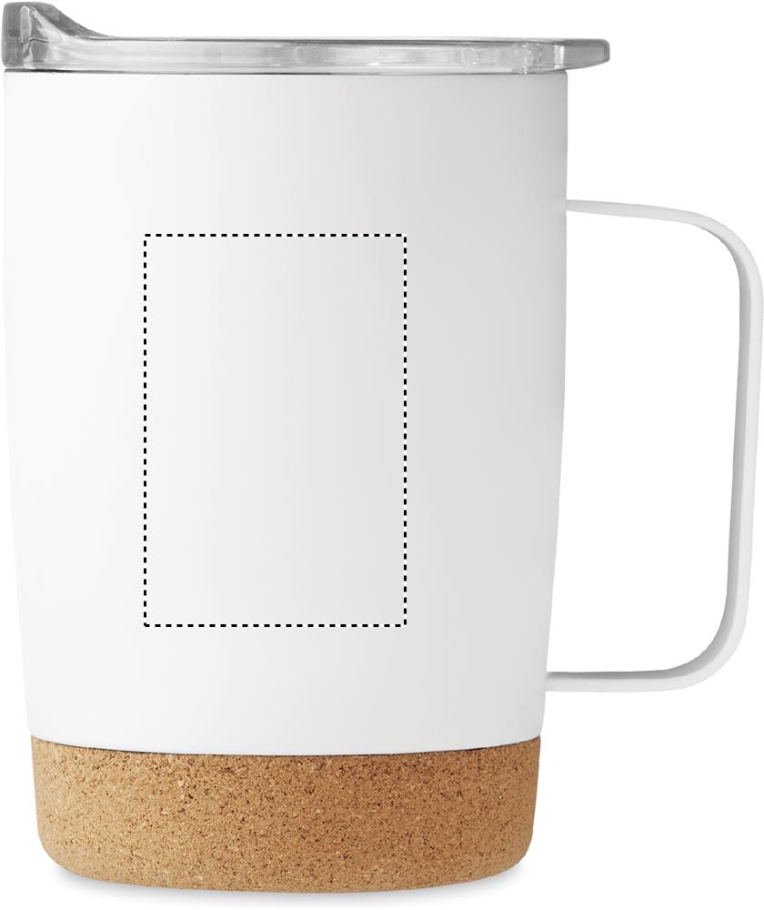 Kaksiseinämäinen ruostumattomasta teräksestä valmistettu 300 ml juomamuki, korkkipohjalla ja liukuva sip-reiän kansi.