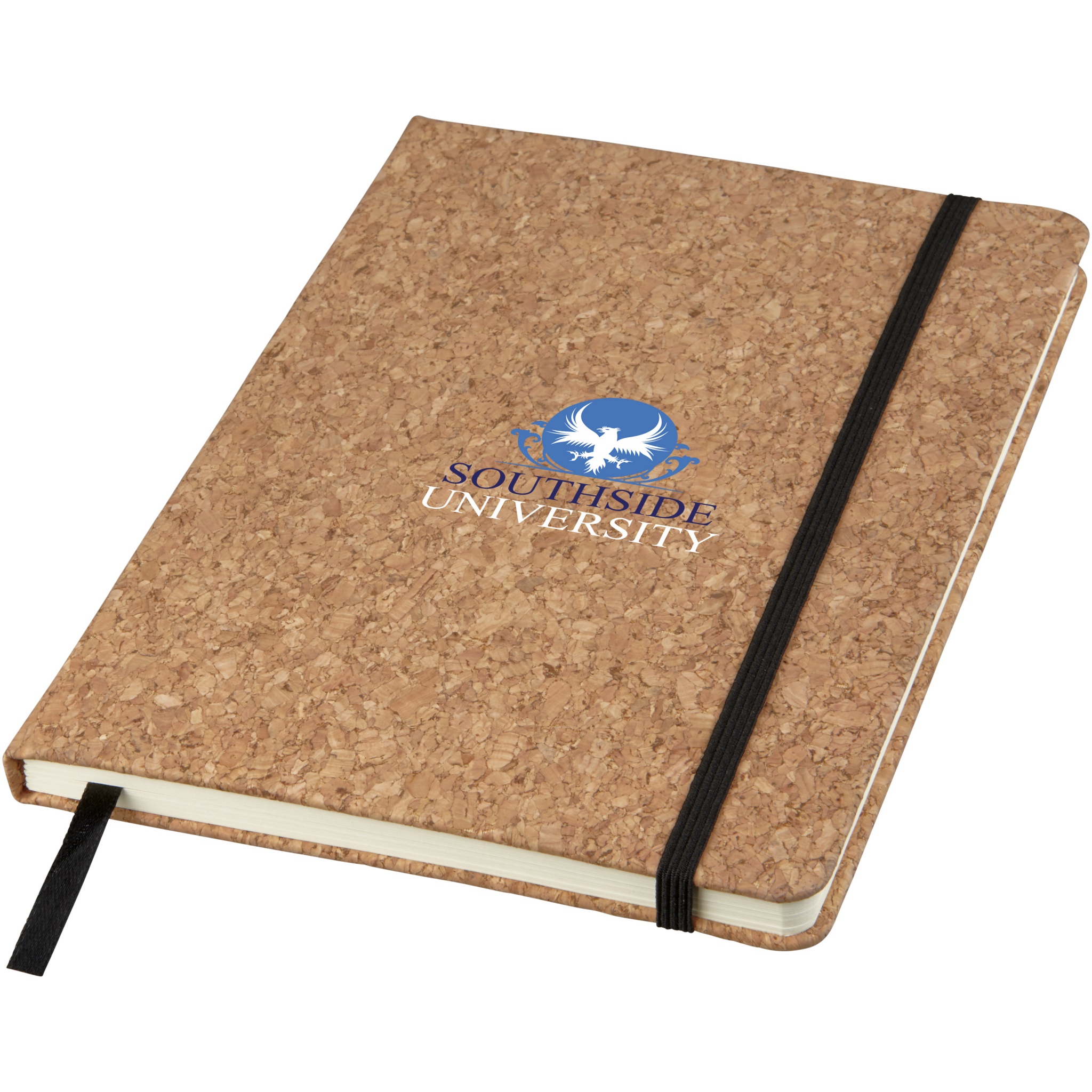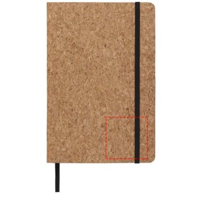 A5-kokoinen muistivihko, jossa on korkkikansi, musta kuminauha ja nyöri. 80 paperiarkkia (70 g/m2).