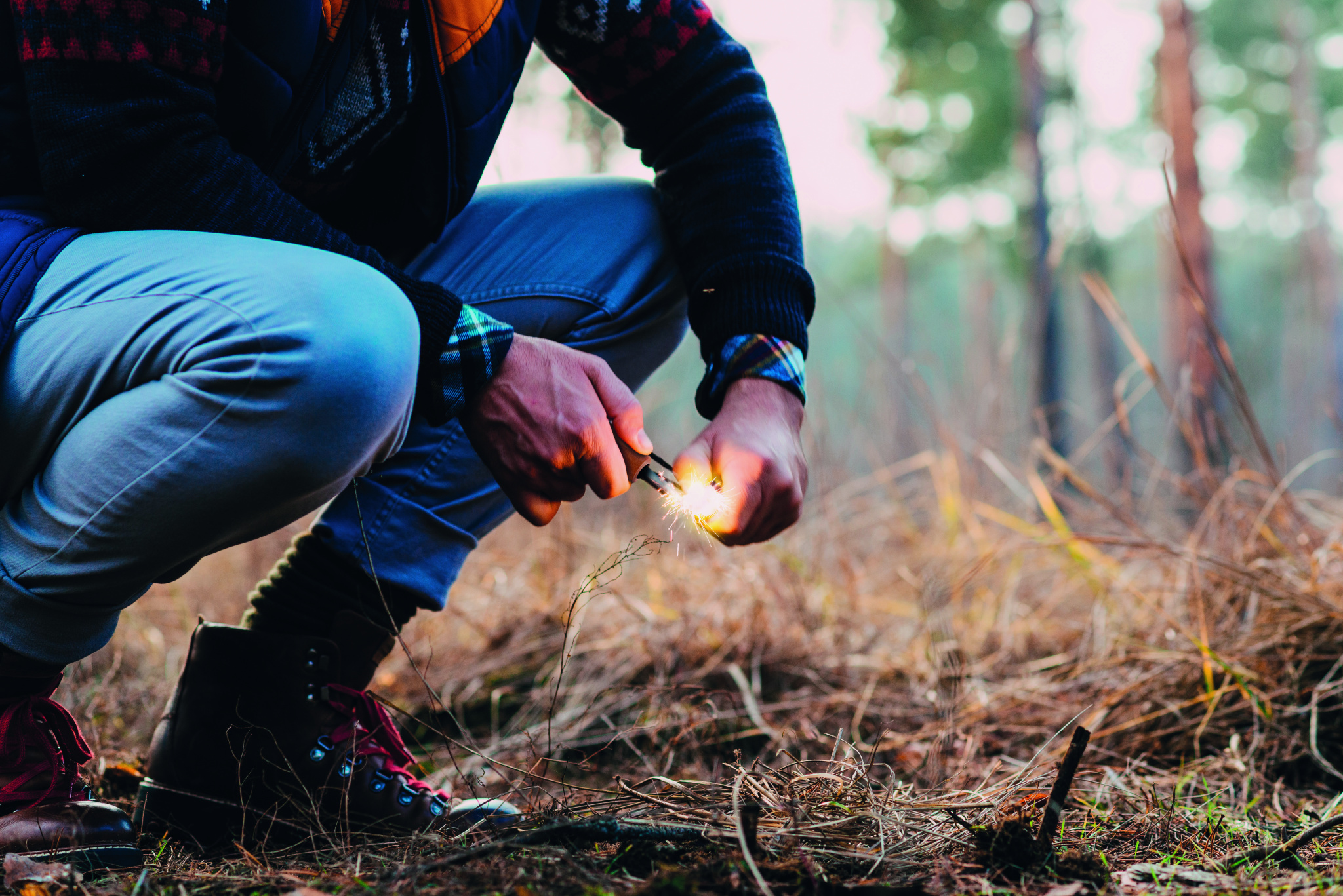 Mäntypuusta ja ruostumattomasta teräksestä valmistetut sytytystyökalut, mukaan lukien sytytystikku, monikäyttöinen kaavin sytytinsytyttimesi kanssa käytettäväksi, pullonavaaja, tarkkuusviivain ja kuusioavain.