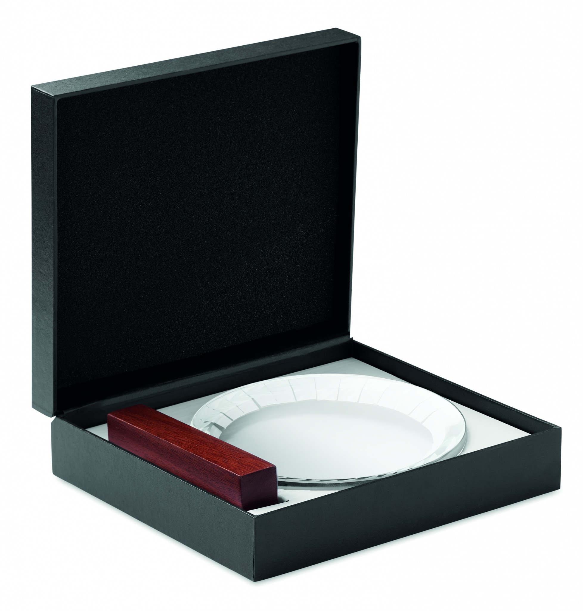 Pyöreä kristallipalkinto tai muistolaatta pyökkipuujalustalla, pakattuna lahjapakkaukseen.