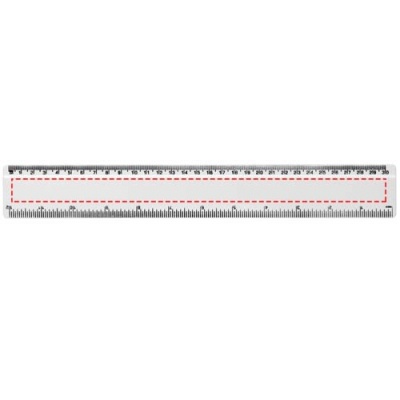 Tukeva kierrätysmuovinen viivain, johon on merkitty tuumat ja senttimetrit.