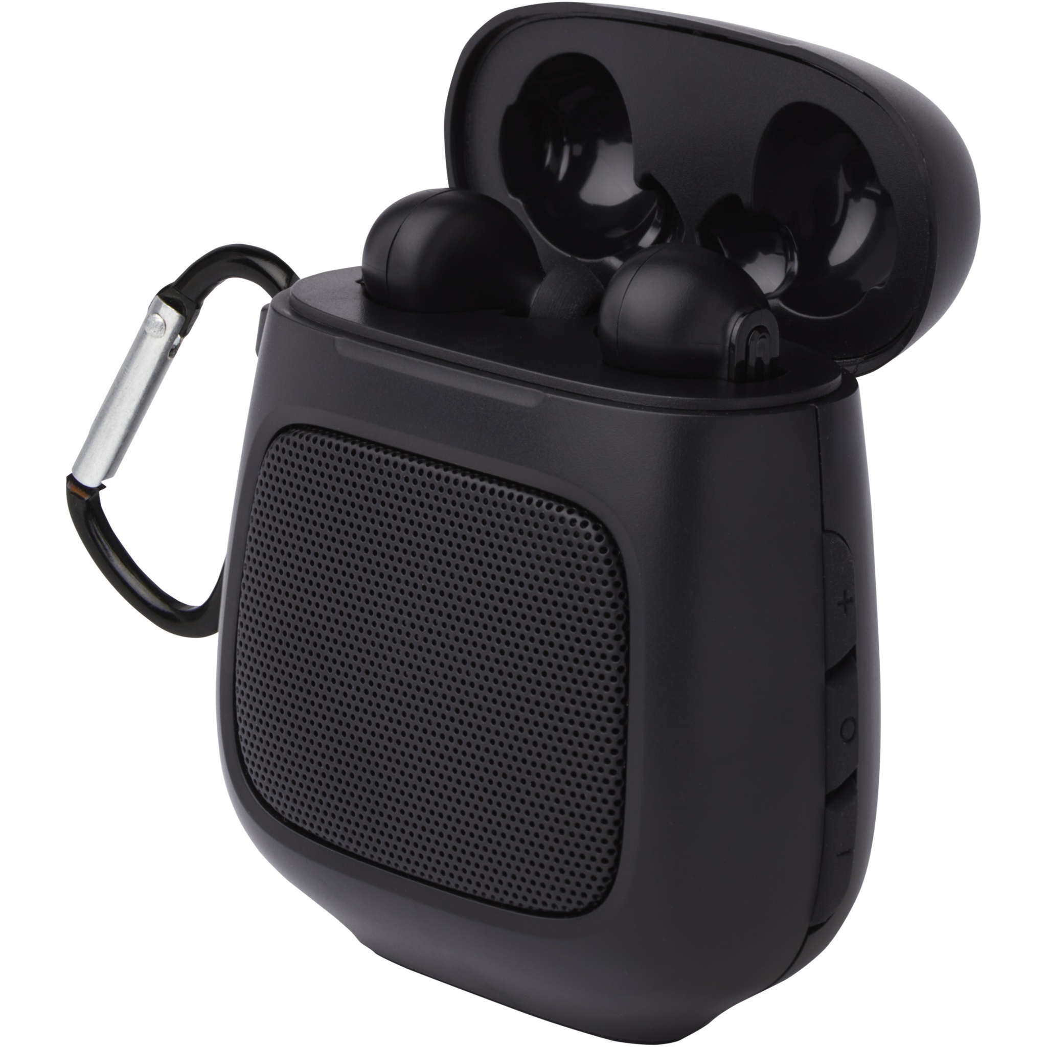 Tämä Remix yhdistää True Wireless -nappikuulokkeet Bluetooth® -kaiuttimeen. Kun nappikuulokkeet otetaan kotelosta, ne kytkeytyvät päälle ja synkronoituvat automaattisesti keskenään. Kuljetuskotelo toimii myös nappikuulokkeiden latausasemana sekä Bluetooth® -kaiuttimena. Kotelo pystyy lataamaan varauksesta tyhjät nappikuulokkeet täyteen neljä kertaa yhdellä latauksella, ja nappikuulokkeita voidaan käyttää vähintään 4 tuntia ennen uusintalatauksen tarvetta. Ergonominen muotoilu pitää nappikuulokkeet mukavasti ja varmasti paikoillaan liikkeessä ollessasi. Nappikuulokkeiden lataaminen tyhjistä täyteen kestää noin kaksi tuntia. Sekä nappikuulokkeissa että kaiuttimessa on sisäänrakennettuina mikrofoni ja musiikkisäätimet puheluiden vastaanottamista tai soittamista varten. Bluetoothin toiminta-alue on 10 metriä. Mukana keskikokoiset ja suuret korvasovittimet. Toimitetaan premium-lahjapakkauksessa.