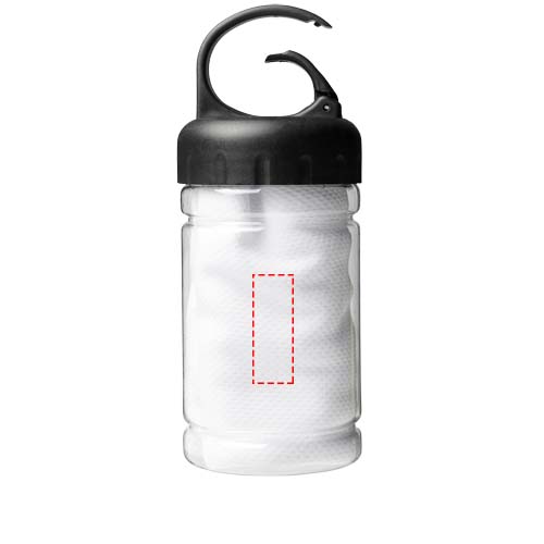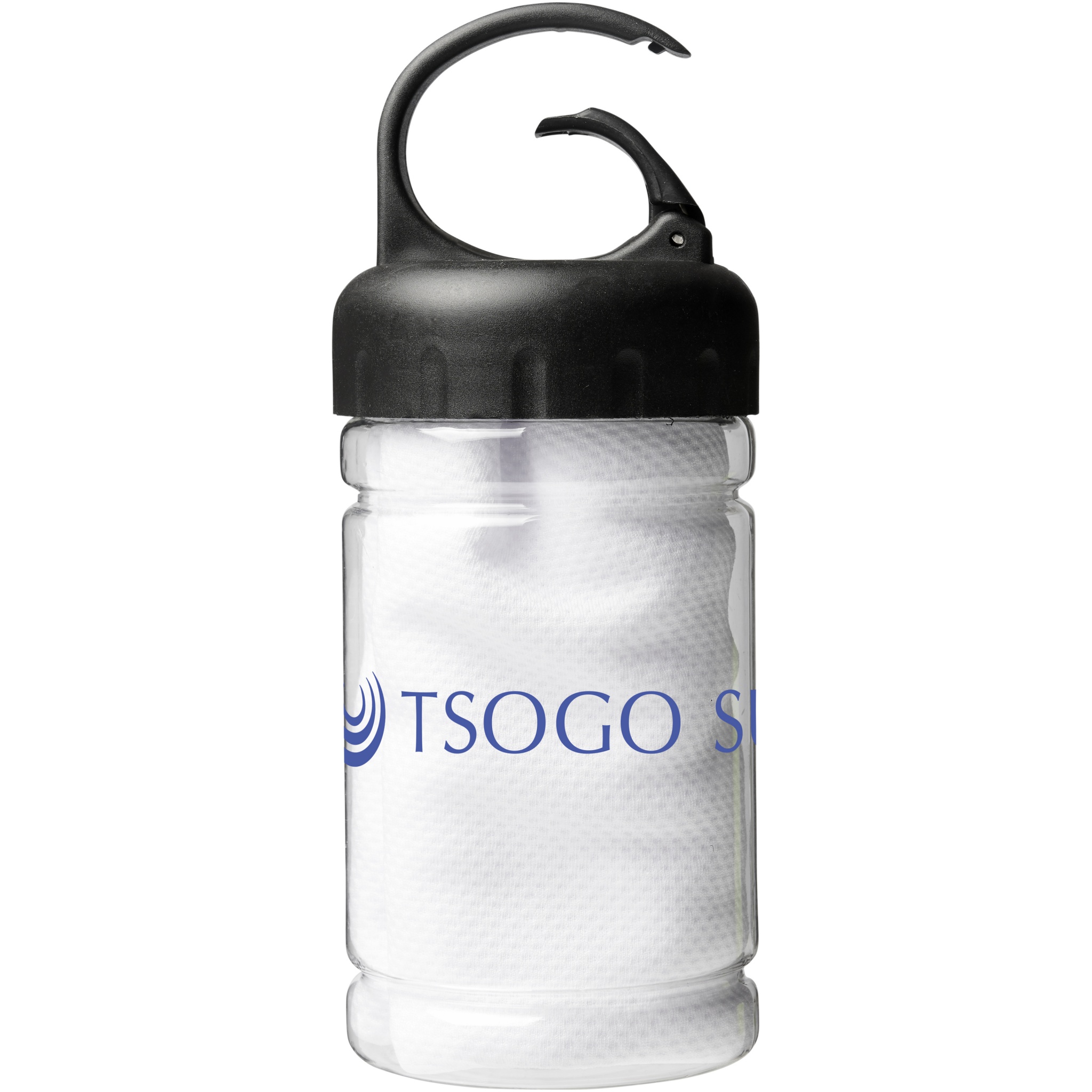 Hyvin imevä ja nopeasti kuivuva ja pestävä jäähdytyspyyhe, joka pitää viileänä treenin tai ulkoilun aikana. Valmistettu vahvasta ja kestävästä polyesteristä. Toimitetaan PET-kotelossa, jossa on kahva ja kiinteä haka kantamisen helpottamiseksi. Saatavilla 5 raikasta väriä. Suuri painatusala, painatus myös mahdollista itse pyyhkeeseen. Koko: 30 x 80 cm.