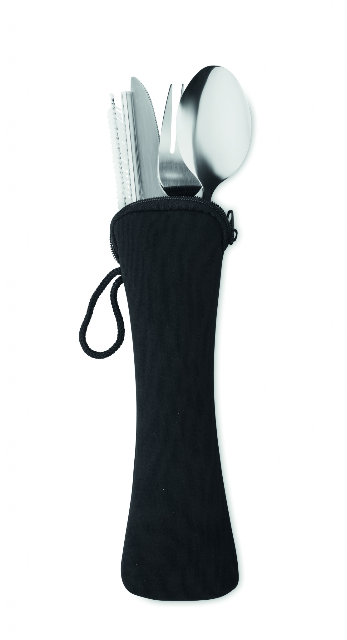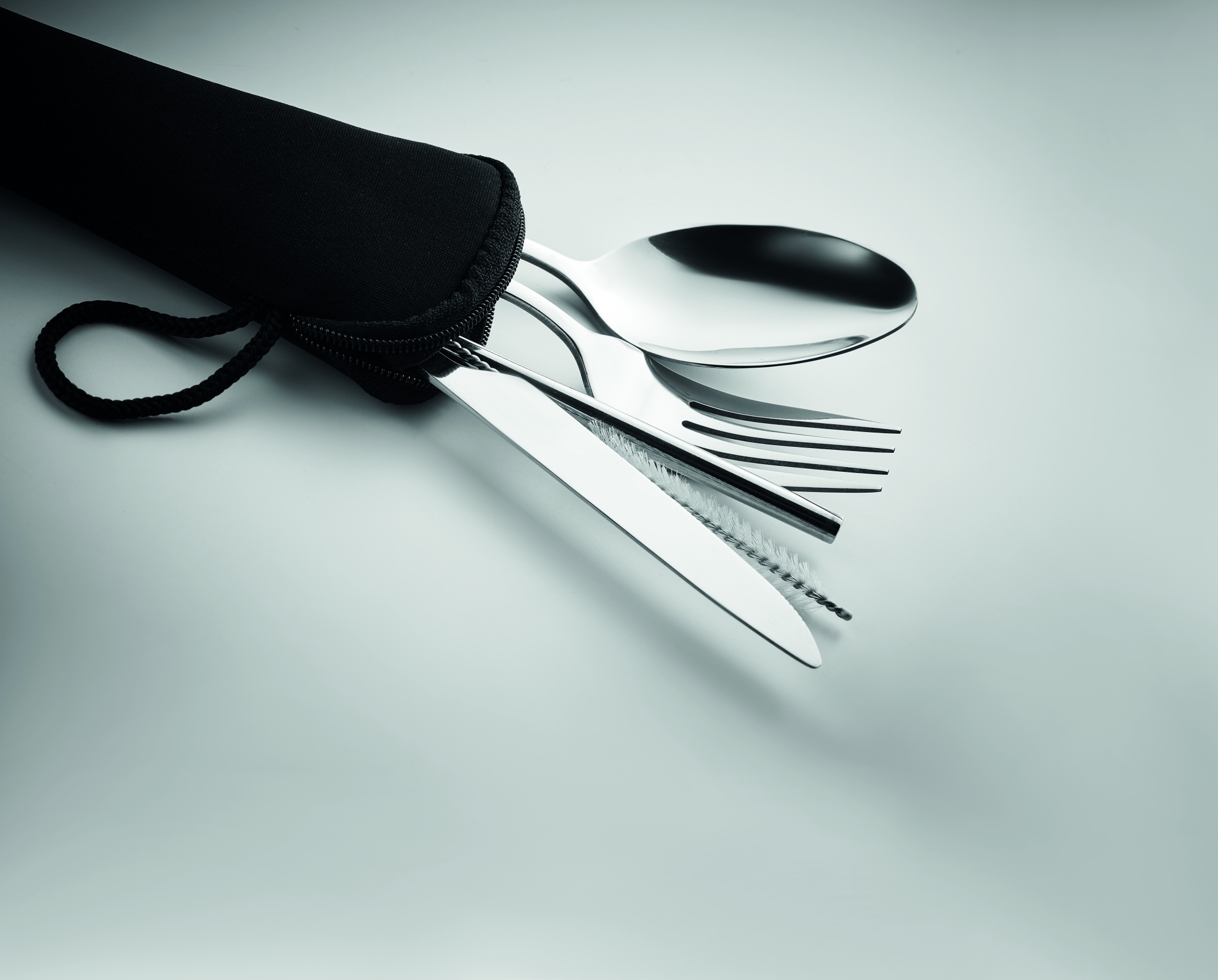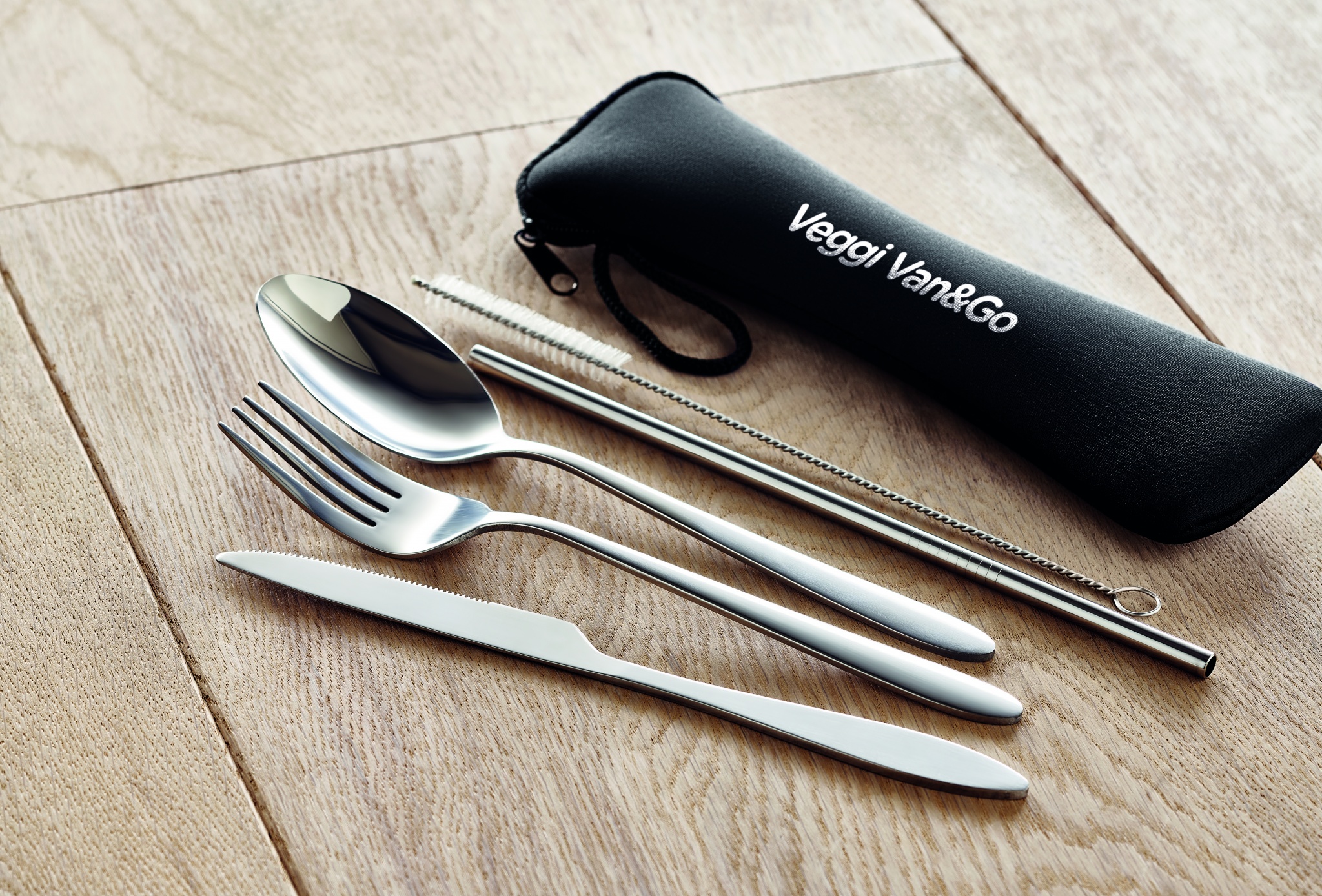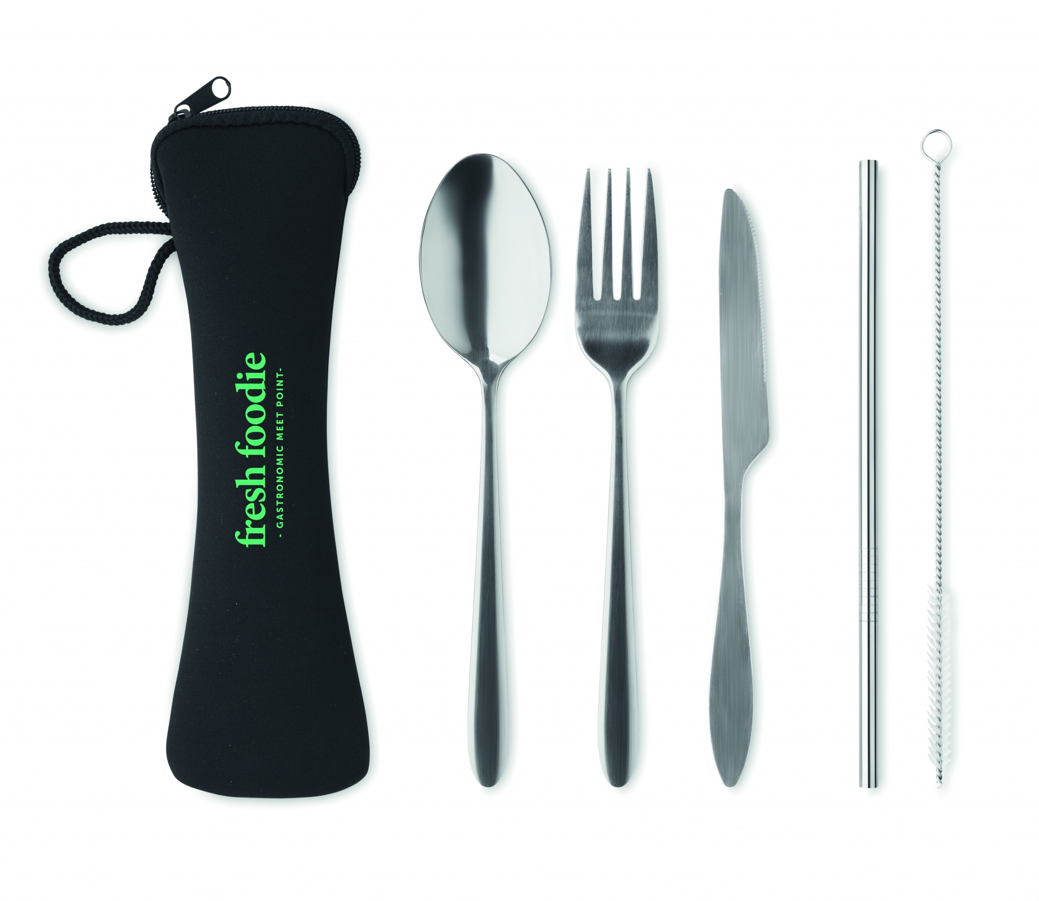 Uudelleenkäytettävä ruostumattomasta teräksestä valmistettu aterinsarja, sisältää haarukan, veitsen, lusikan, pillin ja harjan. Pakattuna neopreenipussiin.