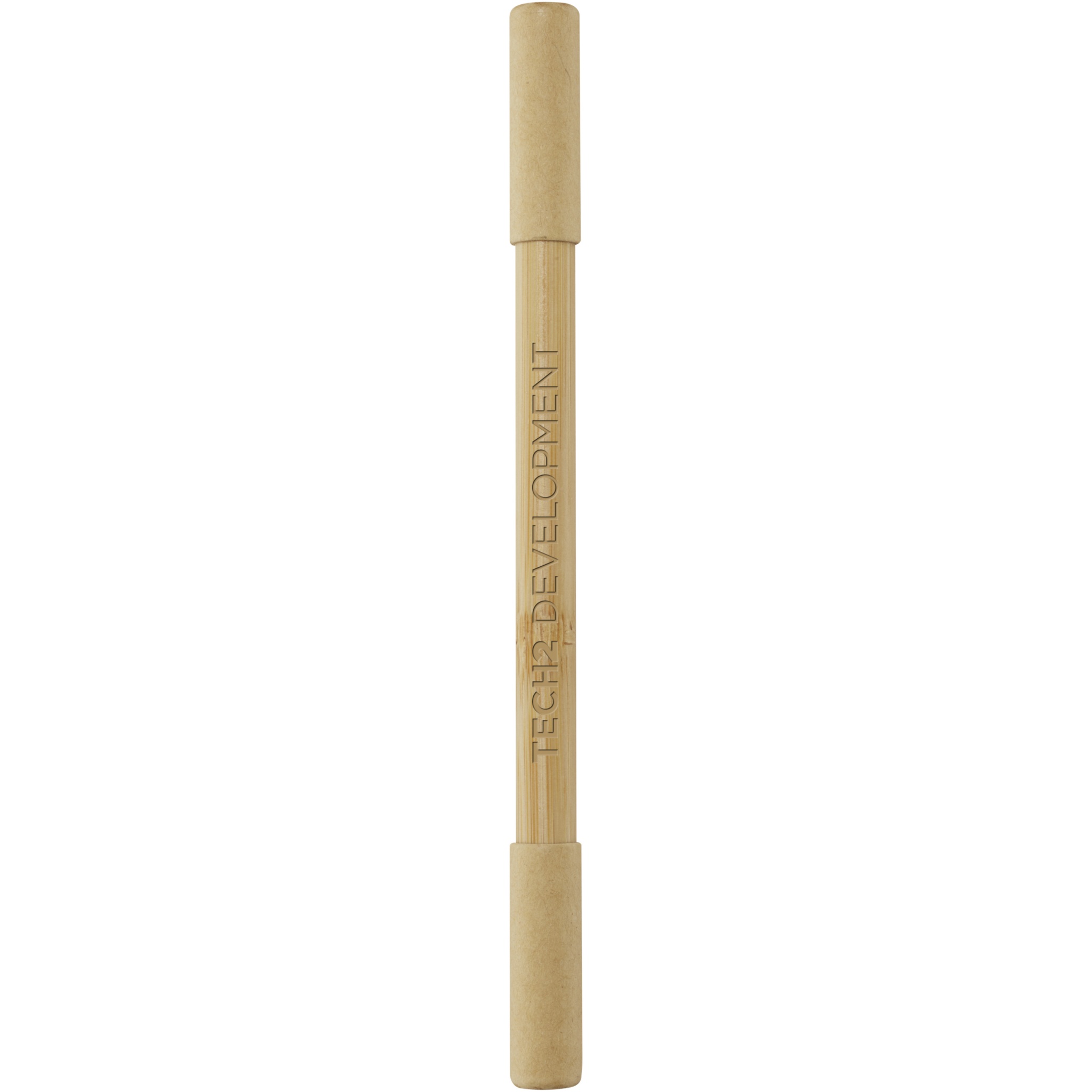 Samambu-bambuduo-kynässä on kaksi päätä: 1 kuulakärkikynä ja 1 musteeton kynä. Musteeton puoli ei vaadi mustepatruunaa tai uudelleentäyttöä. Kynän musta grafiittikärki on suunniteltu jättämään näkyviä jälkiä, kun se koskettaa kirjoituspintaa. Bambusta valmistettu musteeton kynä on ympäristöystävällisempi valinta, joka kannustaa käyttämään uusiutuvia materiaaleja. Kuulakärkikynässä on musta muste. Sen kärki on 1,00 mm ja kirjoituspituus 600 metriä. Kirjoituspituus musteeton kynä: 1500 metriä