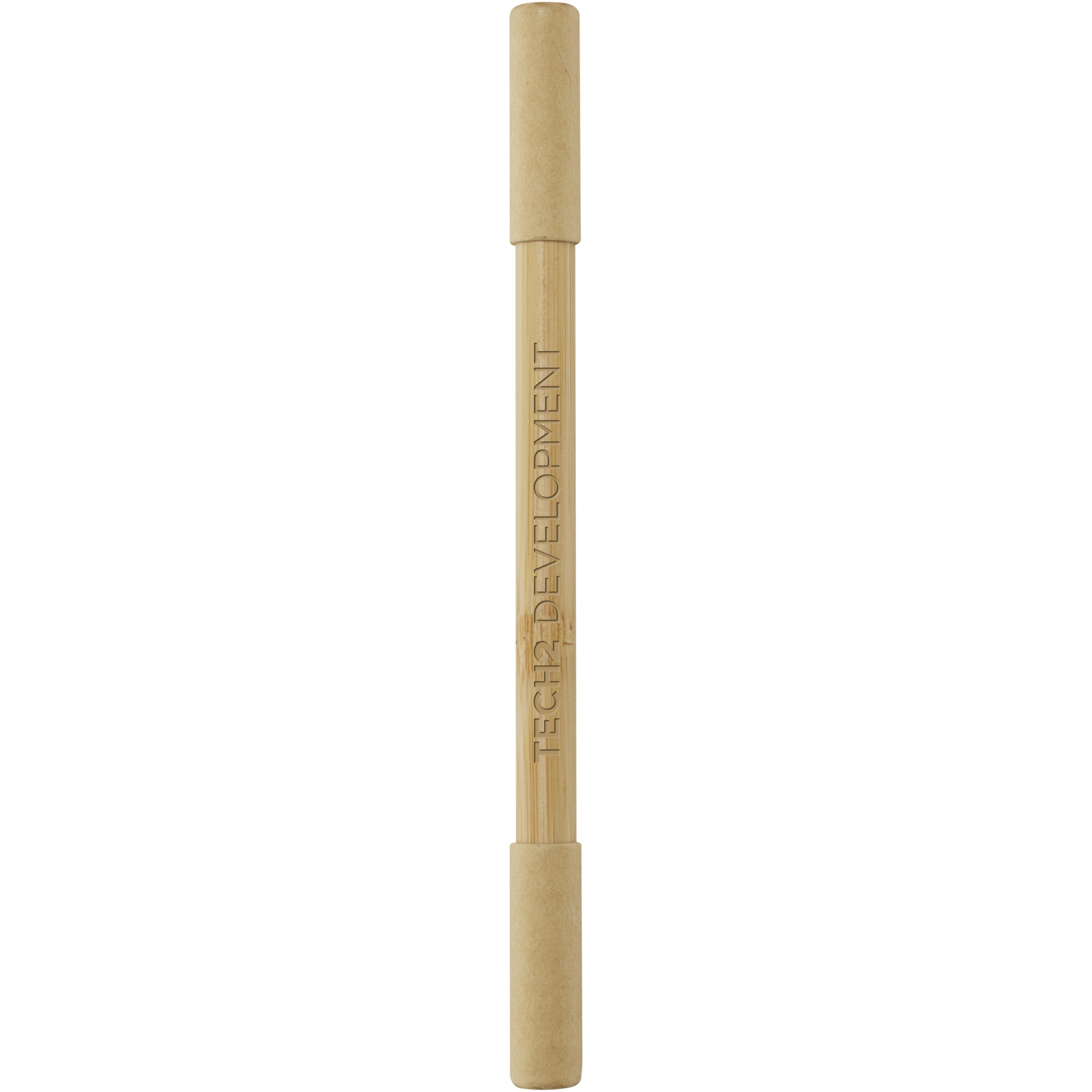 Samambu-bambuduo-kynässä on kaksi päätä: 1 kuulakärkikynä ja 1 musteeton kynä. Musteeton puoli ei vaadi mustepatruunaa tai uudelleentäyttöä. Kynän musta grafiittikärki on suunniteltu jättämään näkyviä jälkiä, kun se koskettaa kirjoituspintaa. Bambusta valmistettu musteeton kynä on ympäristöystävällisempi valinta, joka kannustaa käyttämään uusiutuvia materiaaleja. Kuulakärkikynässä on sininen muste. Sen kärki on 1,00 mm ja kirjoituspituus 600 metriä. Kirjoituspituus musteeton kynä: 1500 metriä.