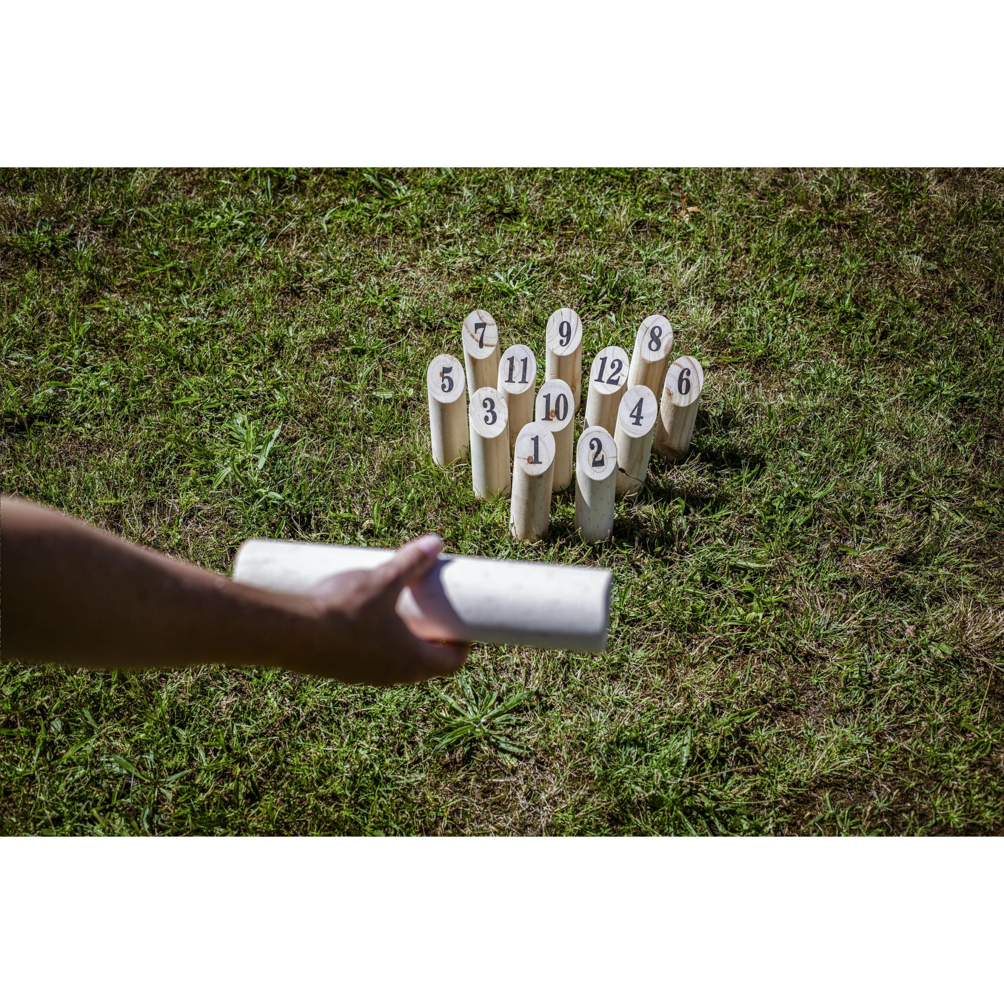 Puinen heittopeli, joka tunnetaan myös nimellä suomalainen keila. Kuka saavuttaa ensimmäisenä vaaditut 50 pistettä? Tämä suomalainen ulkoilupeli vaatii taitoa, tarkkuutta ja strategiaa. Hauskaa leikkiä leirintäalueella tai rannalla. Sopii sekä nuorille että vanhoille pelaajille. 13-osainen setti toimitetaan puuvillapussissa. Sisältää ohjeet. Jokainen tuote toimitetaan erillisessä ruskeassa pahvilaatikossa.