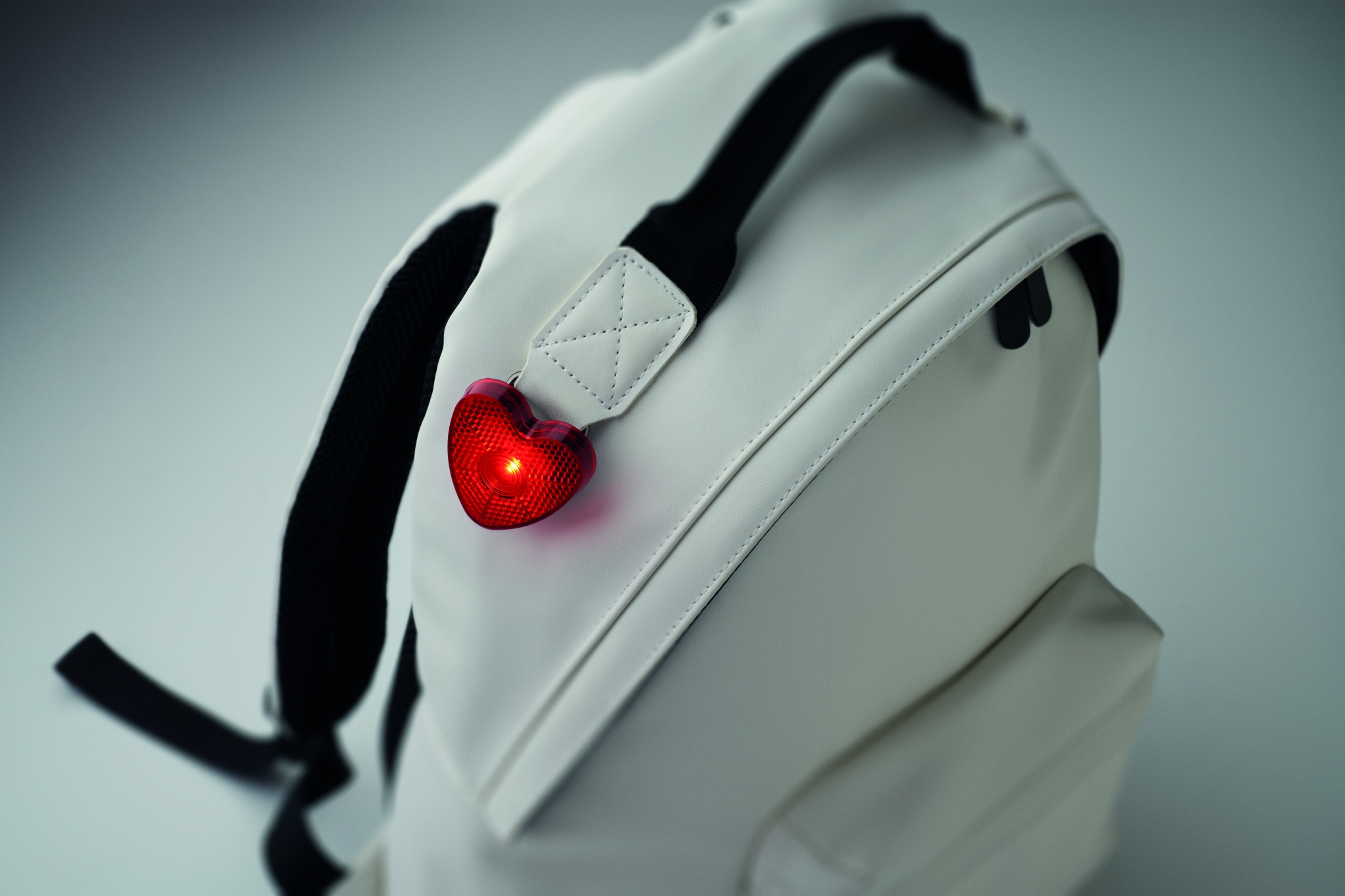 Sydämenmuotoinen ASC-heijastin jossa on punainen valo, ja jossa on takakiinnike. Sisältää 2 LR44-paristoa, jotka voidaan vaihtaa.