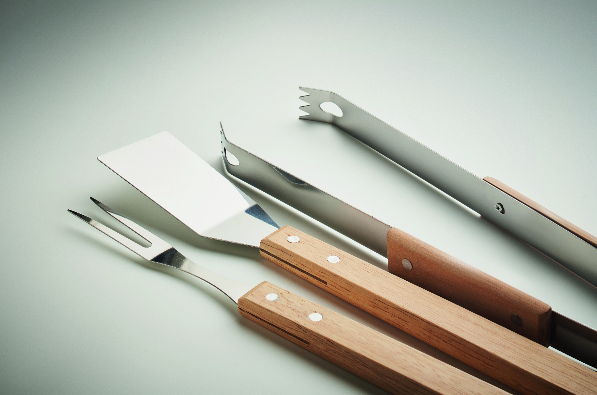 Sarja 3 ruostumattomasta teräksestä valmistettua grillityökalua: lapio, haarukka ja pidike tammipuukahvalla. Toimitetaan kannellisessa kraftlaatikossa.