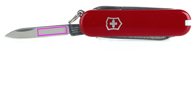 Pienen kokonsa ansiosta Classic SD -taskuveitsi on täydellinen erittäin käytännöllinen avaimenperä. Ominaisuudet: 1.pieni leikkausterä, 2.minisakset, 3.kynsiviila 4.ruuvimeisselin kärjellä, 5.hammastikku, 6.pinsetit, 7.avaimenperä