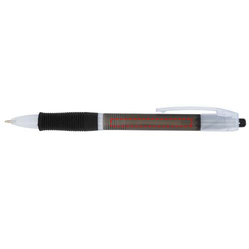 Värikäs kuulakärkikynä, jossa on läpinäkyvä runko ja väriin sopiova kumiote. Click-toiminto.