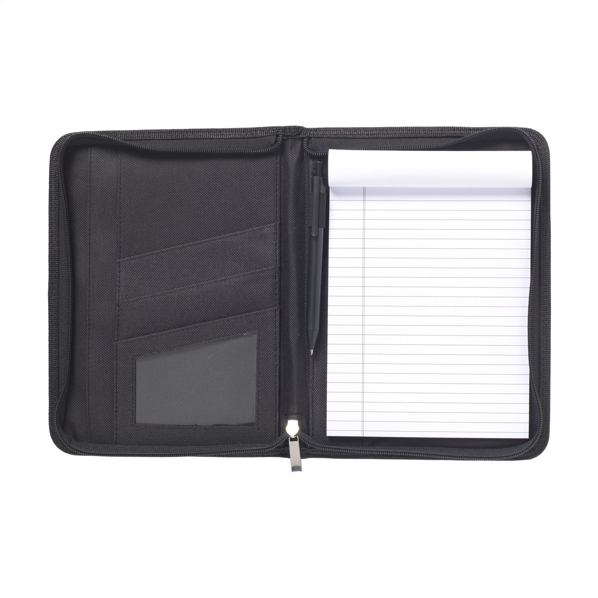 Neuvottelu-/asiakirjakansio hienosta bondoidusta nahasta, A5-kokoinen. Useilla taskuilla ja vetoketjulla. Sisältää kirjoitusalusta ja kuulakärkikynä. Jokainen tuote on pakattu erikseen.