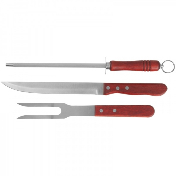 Tyylikäs kaiverrusveitsi ja -haarukka, joka koostuu kaiverrusveitsestä, haarukasta ja terän teroittimesta. Pakattu kauniiseen puulaatikkoon. Logosi painetaan puulaatikkoon.