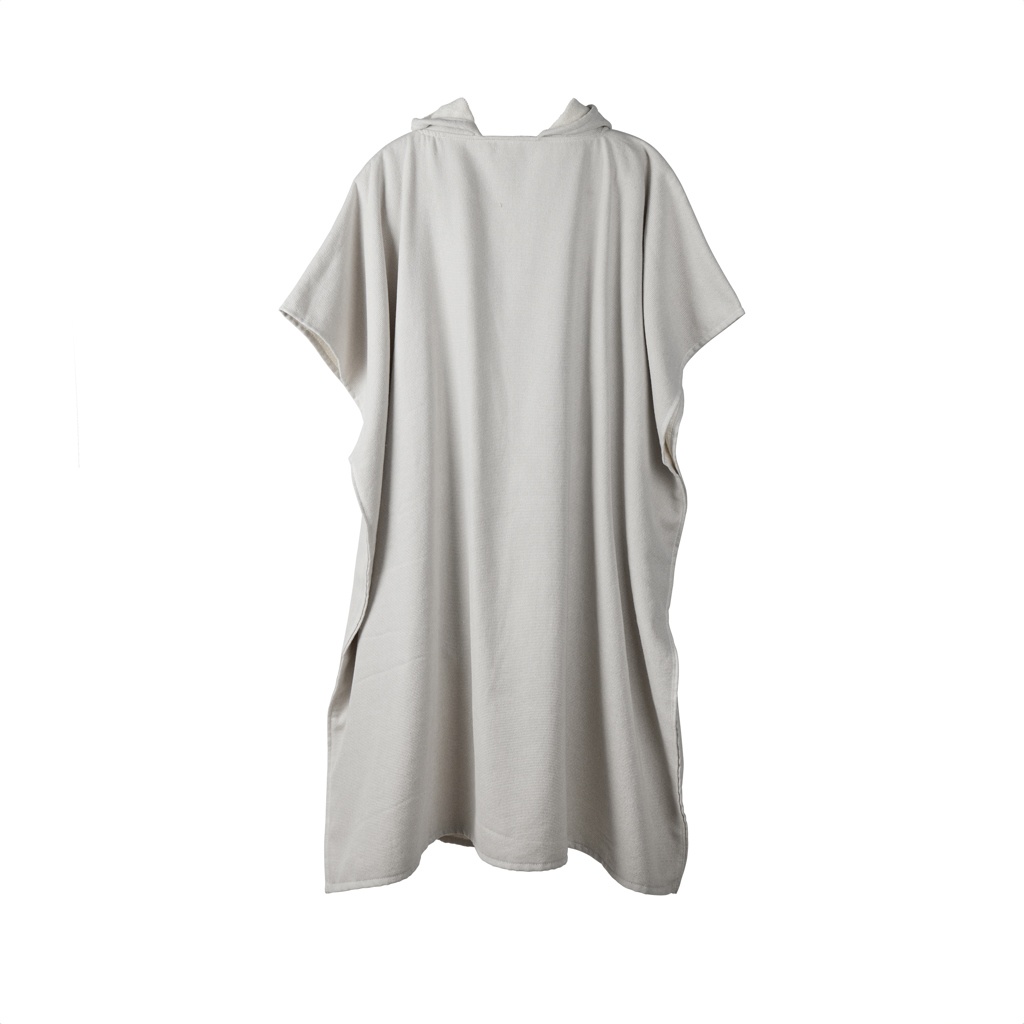 Hamam-poncho, jossa on kaksi erilaista tekstuuria: toinen puoli froteeta ja toinen puoli sileää kudosta. Poncho on käytännöllinen ja monipuolinen vaate, joka sopii erinomaisesti rannalle tai uima-altaalle. Sen imukyky on erinomainen ja se kuivuu nopeasti. Poncho on valmistettu 75 % puuvillasta ja 25 % polyesteristä, ja sen paksuus on 360 g/m². Mitat: 100 x 95 cm. OEKO-TEX® STANDARD 100. 09.HIN.68091. Hohenstein HTTI.