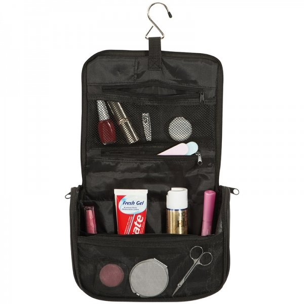 190T nylon-wc-laukku, jossa on suuri sisälokero, 3 vetoketjullista lokeroa, 4 kuminauhaa ja ripustuskoukku. Painamme logosi etupuolelle.