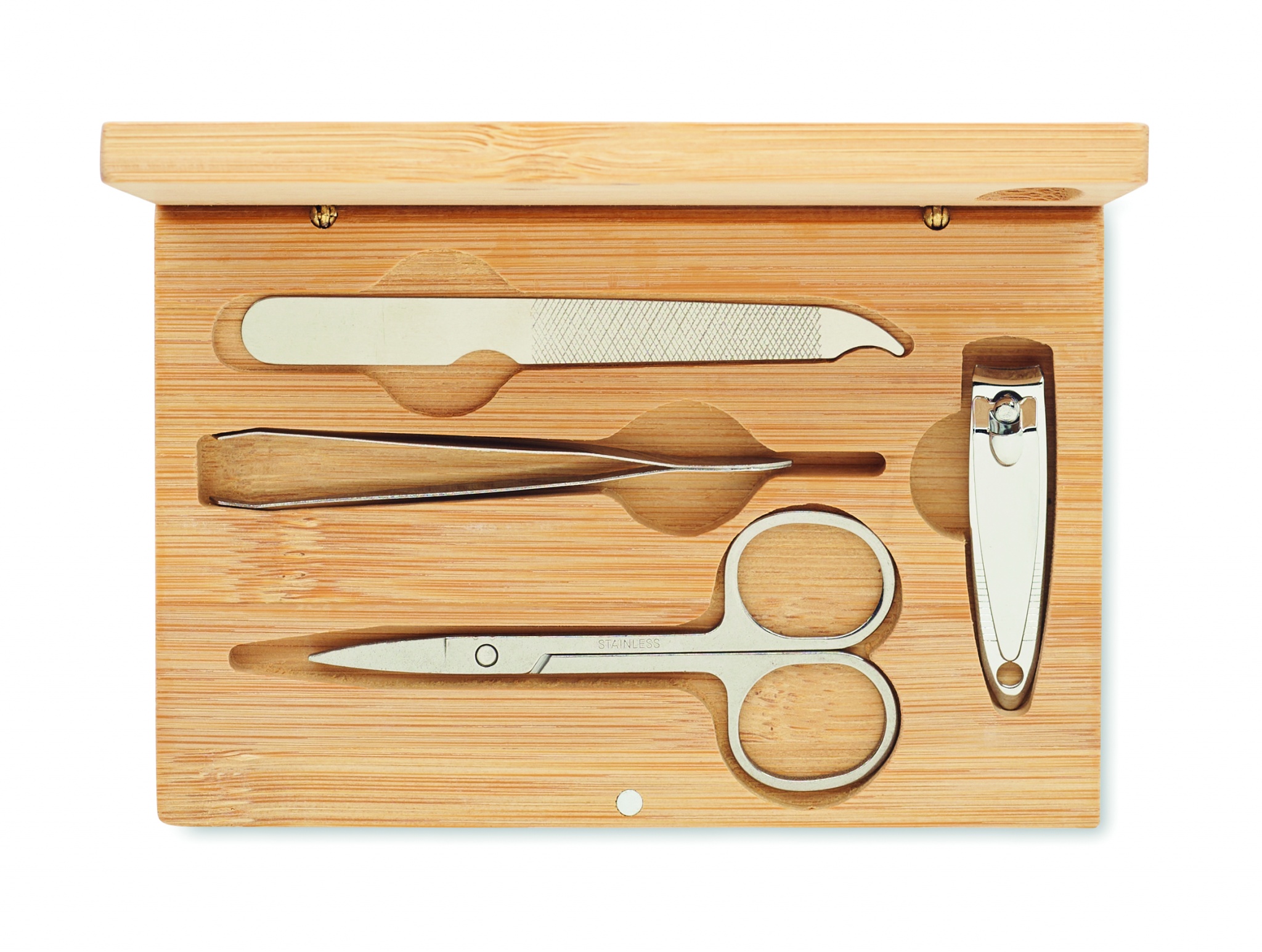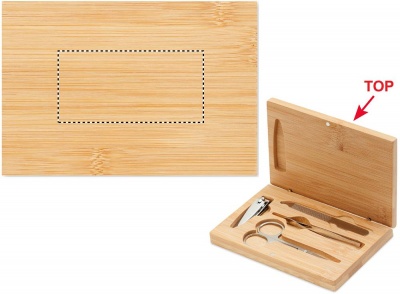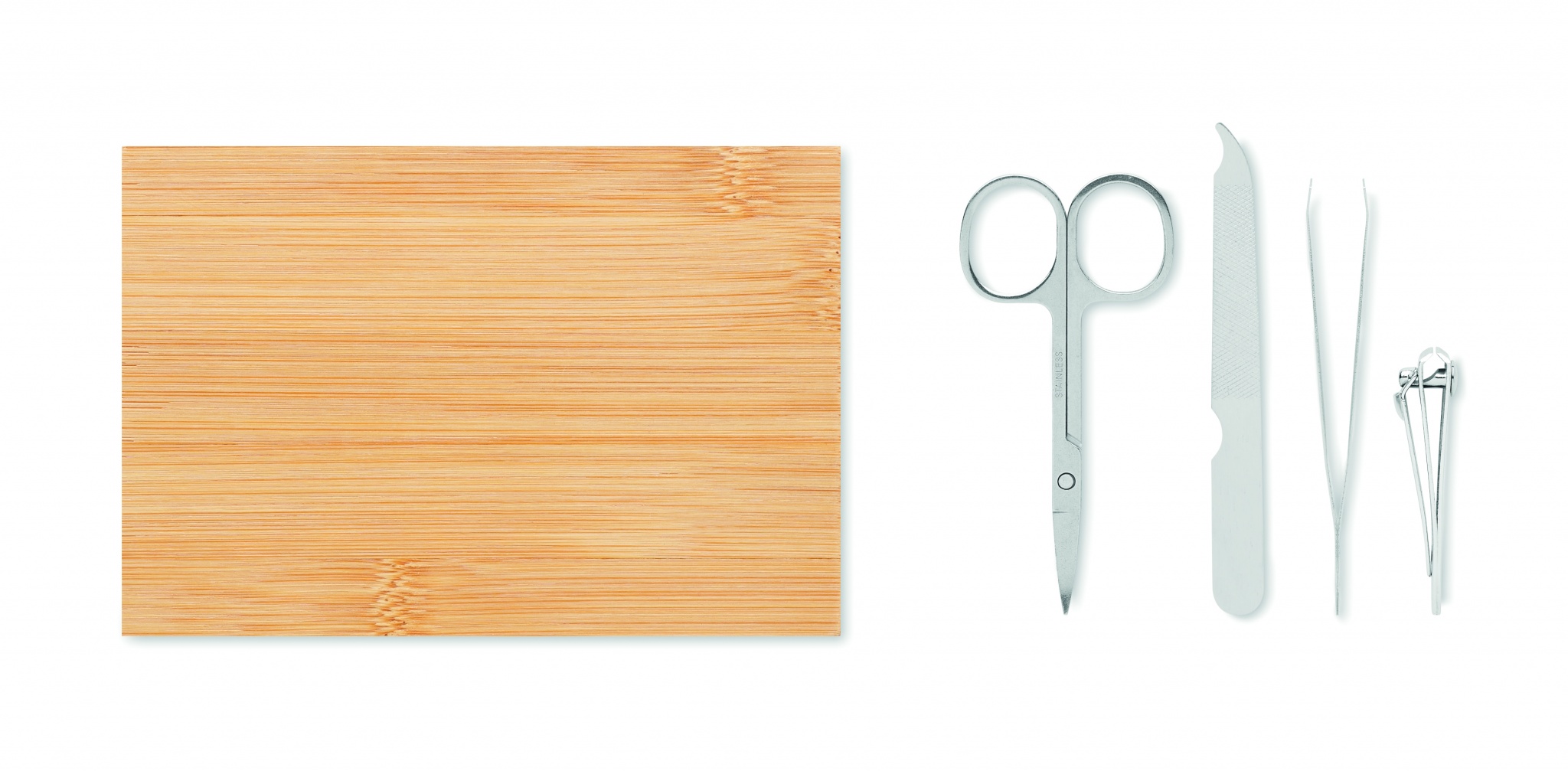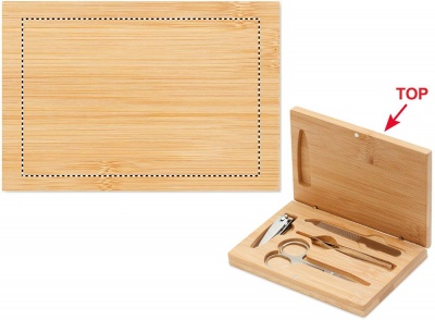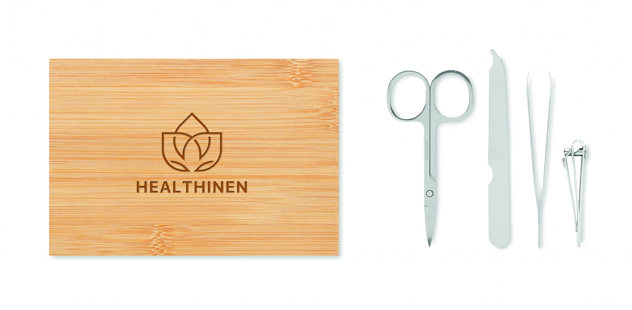 4 dalių nerūdijančio plieno manikiūro rinkinys bambukiniame dėkle su magnetiniu užsegimu. Įskaitant: lenktos nagų žirklės, nagų žirklės, nagų dildė ir pincetas. Bambukas yra natūralus produktas, gali šiek tiek skirtis kiekvieno gaminio spalva ir dydis, o tai gali turėti įtakos galutiniam dekoravimo rezultatui.