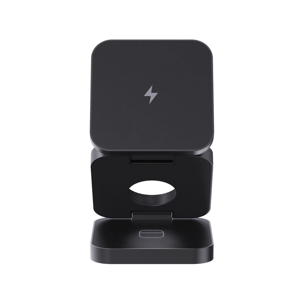 Prabangus ir sulankstomas „trys viename“ belaidis įkroviklis, pagamintas iš RCS perdirbto ABS ir RCS perdirbto aliuminio. Bendras perdirbtas turinys: 46% pagal bendrą prekės svorį. RCS sertifikatas užtikrina visiškai sertifikuotą perdirbtų medžiagų tiekimo grandinę. Belaidžiame įkroviklyje yra magnetinis 15 W belaidis įkroviklis ir papildomas 5 W belaidis įkroviklis, tinkamas ausinių dėkliukams ar kitiems mažiems belaidžiams įkraunamiems įrenginiams, bei 2,5 W belaidis įkroviklis išmaniesiems laikrodžiams (tik Apple laikrodžiams). Įskaitant RCS sertifikuotą 120 cm perdirbtą TPE laidą. Supakuota į FSC® mix kraft pakuotę. Prekė ir priedai 100% be PVC. Įvestis: 9V/3A optimaliam naudojimui. Išėjimas: Telefonas: 9V/1.1A; 9V/1,67 A/(15W), ausinės: 5V/1A (5W), laikrodis: 5V/0,5A. Be PVC.
