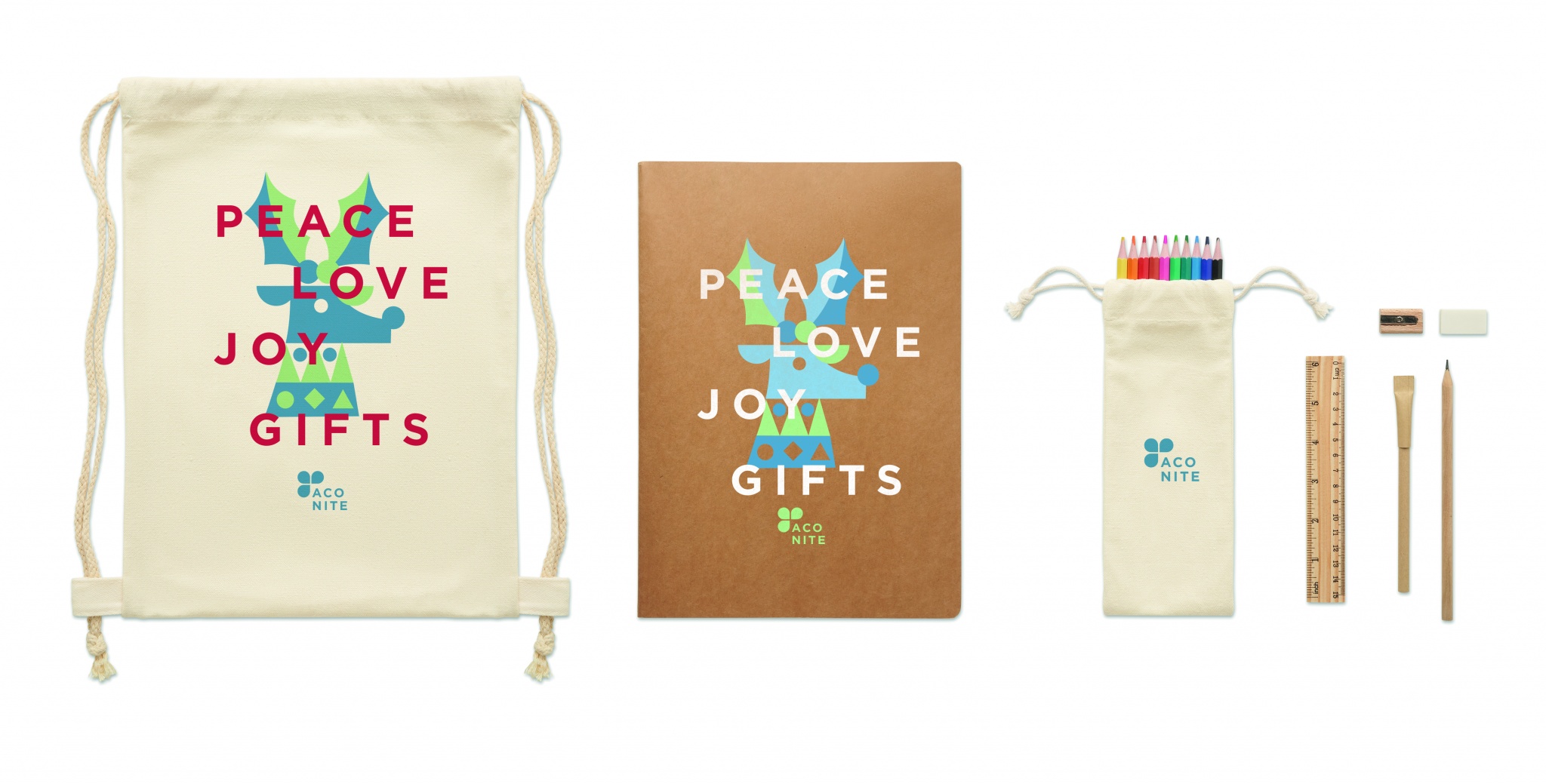 Vaikų piešimo ir 5 dalių raštinės reikmenų rinkinys, kurį sudaro medinė liniuote, medinis drožtukas, trintukas, medinis pieštukas ir kartoninis tušinukas. Papildomai 10 spalvinimo pieštukų, A4 perdirbto popieriaus 50 paprastų lapų (100 puslapių). Pateikiamas medvilniniame maišelyje su virvelėmis.