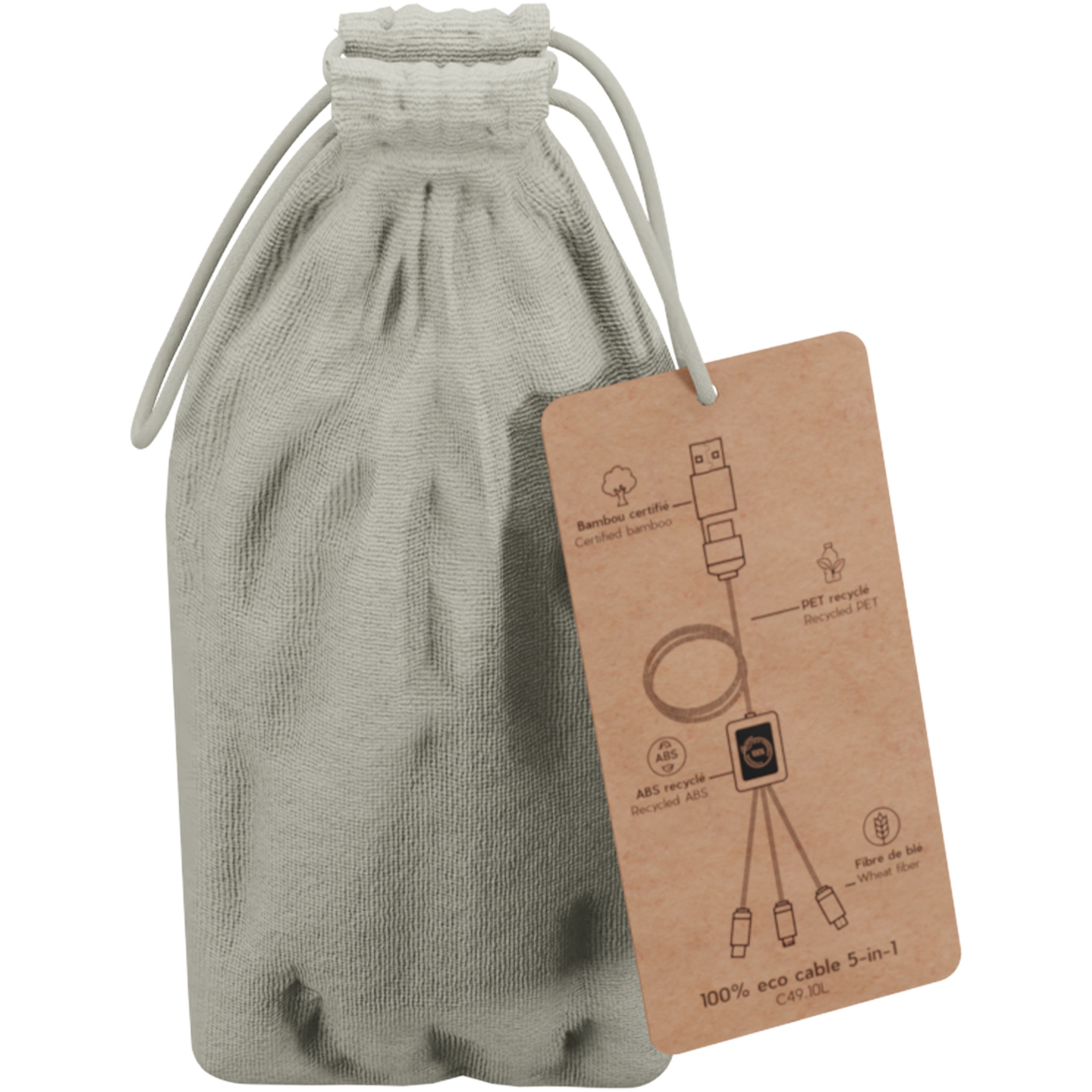 2,4 A ātrās uzlādes kabelis (3 x 10 cm), ko var pielāgot ar apgaismojošu logotipu abās pusēs, kas arī var atšķirties. Šis kabelis ir pilnībā izgatavots no ilgtspējīgākiem materiāliem: pārstrādātām PET auklām, bambusa, kviešu šķiedrām un pārstrādātas plastmasas. Uzlādes kabelis ir izveidots kā universāls, pateicoties tā 3 izejām (Type-C, Android, iPhone), un tas var vienlaikus uzlādēt līdz pat trim ierīcēm. Pateicoties dubultajai USB un USB-C ieejai, šis kabelis ir saderīgs ar jaunākajiem lādētājiem. Tiek piegādāts kokvilnas maisiņā (20 x 8 cm) ar kraftpapīra kartiņu.