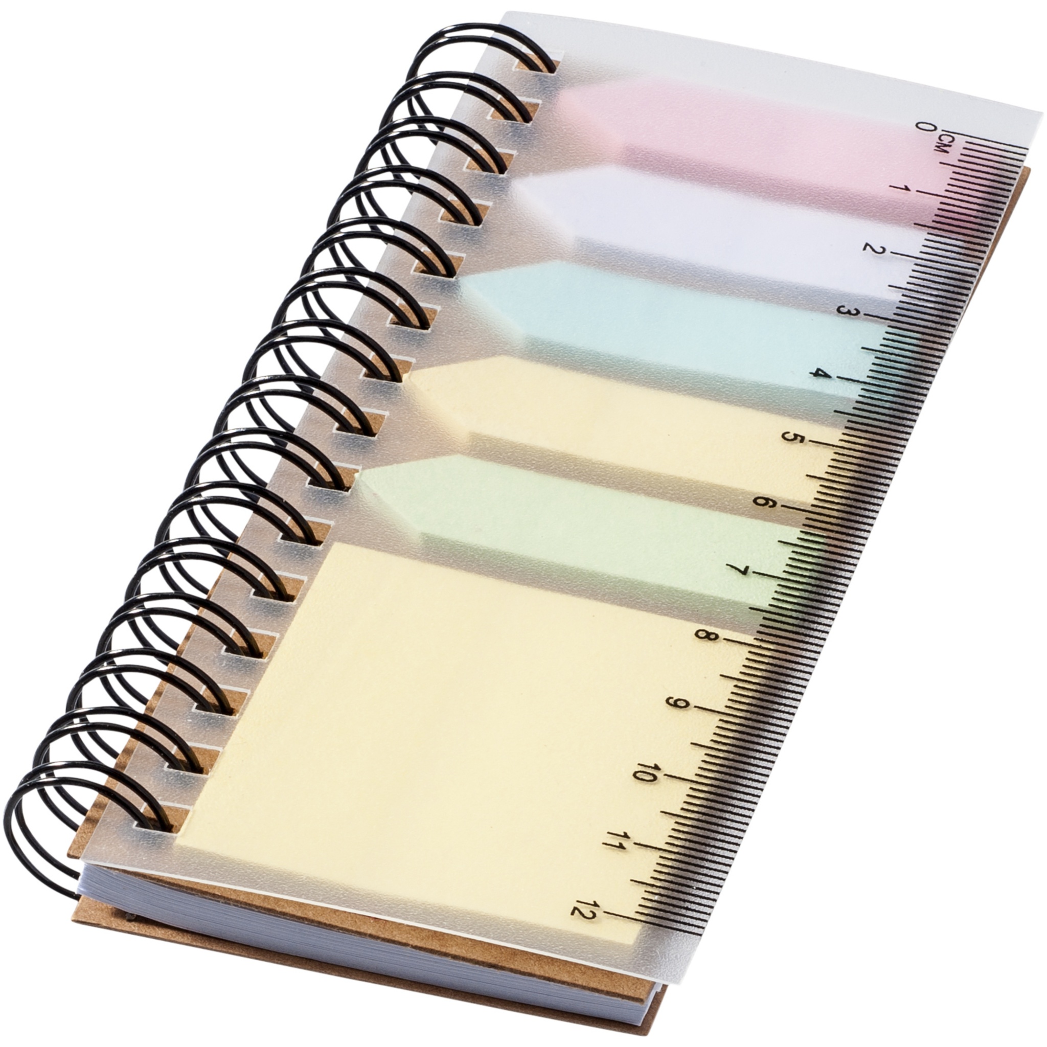 Spinnerveida piezīmju grāmatiņa ar krāsainām līmlapiņām. Buklets ar 25 līmlapiņām 5 krāsās, piezīmju grāmatiņa ar 25 lapām un 40 lappusēm rindu, balta papīra. Ietver lineālu uz priekšējā vāka.