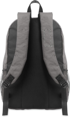 Backpack in 600D RPET polyester with decorating cord and front zippered pocket panel. Mesh pockets on both sides.