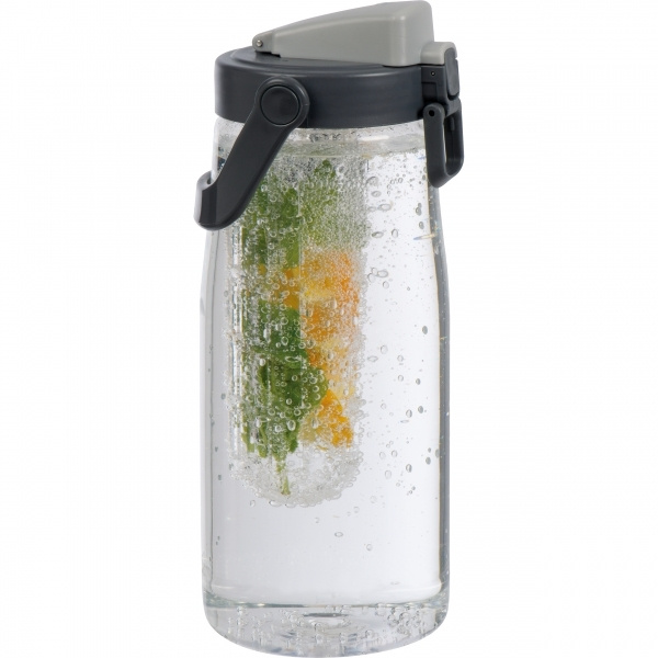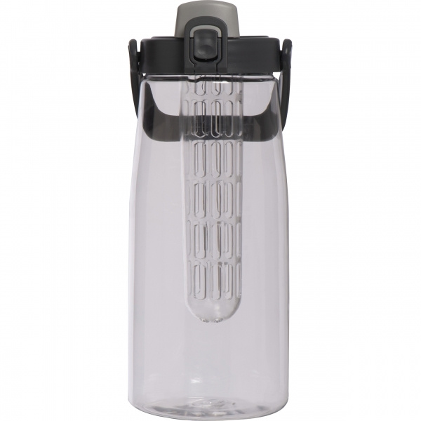 Большой диспенсер для напитков из пластика с запирающимся носиком, ручкой для переноски, сетчатой вставкой, например, для фруктов, и емкостью 2500 мл. Мы напечатаем ваш логотип на нижней части бутылки.