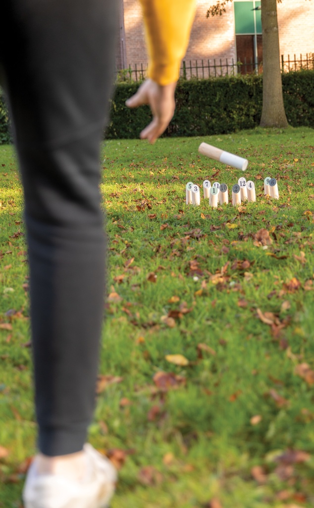 Эта захватывающая тактическая игра предлагает игрокам бросать деревянный цилиндр снизу вверх в 12 деревянных кеглей. Первый игрок, набравший ровно 50 очков, побеждает. Превышать 50 очков не разрешается. Это может показаться простым, но это очень сложно! После каждого броска кегли возвращаются в вертикальное положение. В набор входит: 12 пронумерованных кеглей и 1 деревянный цилиндр для метания, все из прочной сосны. Поставляется в хлопчатобумажном мешочке с книгой правил.