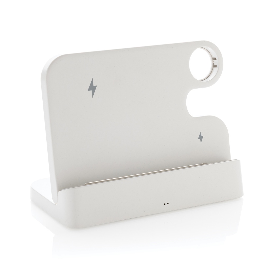Складная подставка для зарядки с беспроводным зарядным устройством 15 Вт из переработанного АБС. Со вторым беспроводным зарядным устройством 5 Вт для зарядки небольших предметов, таких как наушники. С гнездом iWatch для установки официального зарядного кабеля для iWatch. На задней стороне есть выходной порт USB A и USB C 5 В/1 А для зарядки предметов с помощью кабеля. С силиконовыми наконечниками на дне, чтобы избежать скольжения, и силиконовой амортизацией подставки, чтобы ваш телефон оставался в идеальном состоянии. Общее количество переработанных материалов: 80 % от общего веса предмета. Сертификация RCS гарантирует полностью сертифицированную цепочку поставок переработанных материалов. Упаковано в упаковку FSC®. Не содержит ПВХ. Включает переработанный RCS TPE 120 см кабель для зарядки USB A - USB C. Упаковано в упаковку FSC®. Не содержит ПВХ