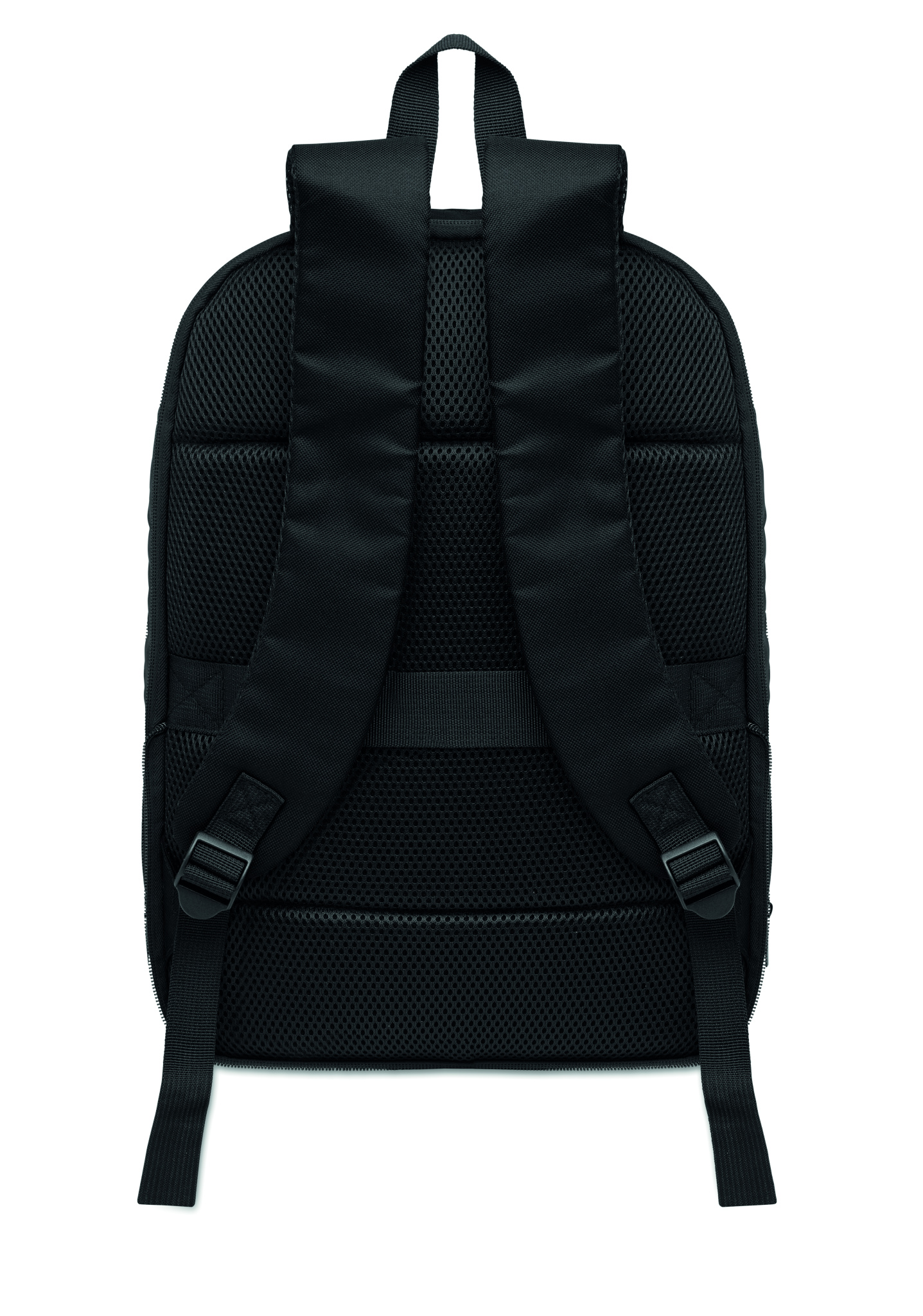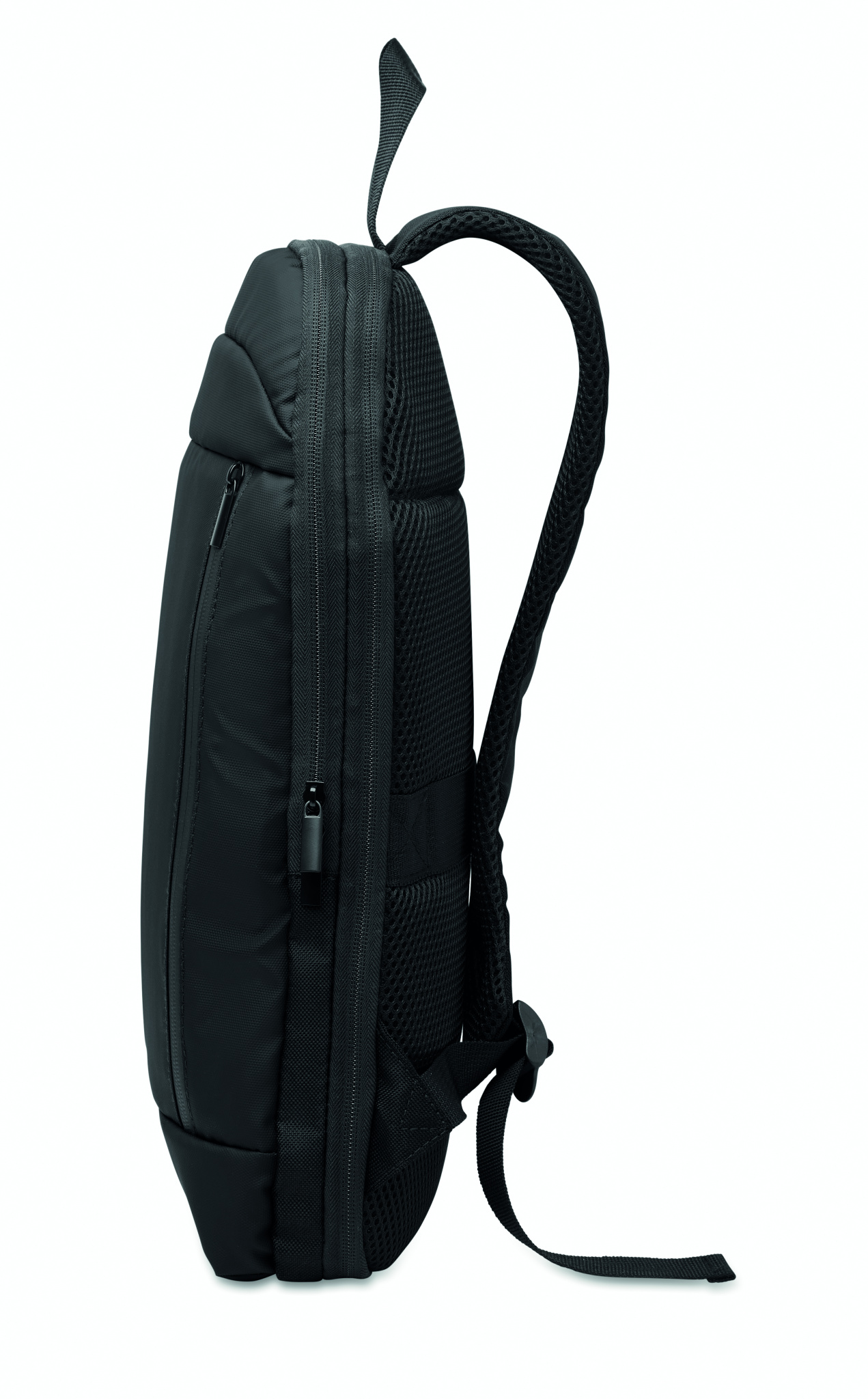 Expandable 600D RPET polyester computer backpack 16'' with PU coating on front and RPET polyester lining. Hidden zippered pocket and padded laptop compartment, front compartment, mesh back and luggage strap.