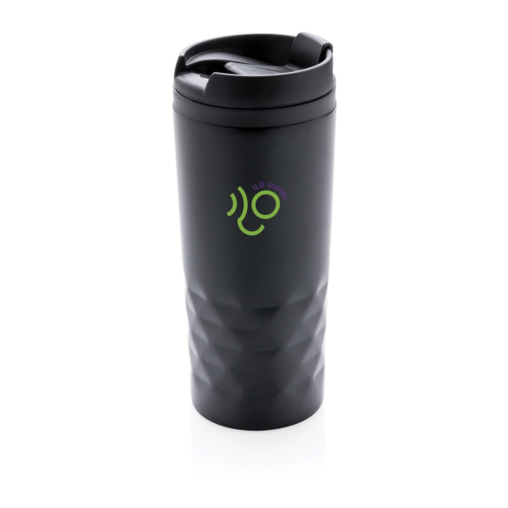 Модный стакан из нержавеющей стали с геометрическими деталями. Внутренний корпус изготовлен из пластика. Мыть только вручную. Объем 300 мл.