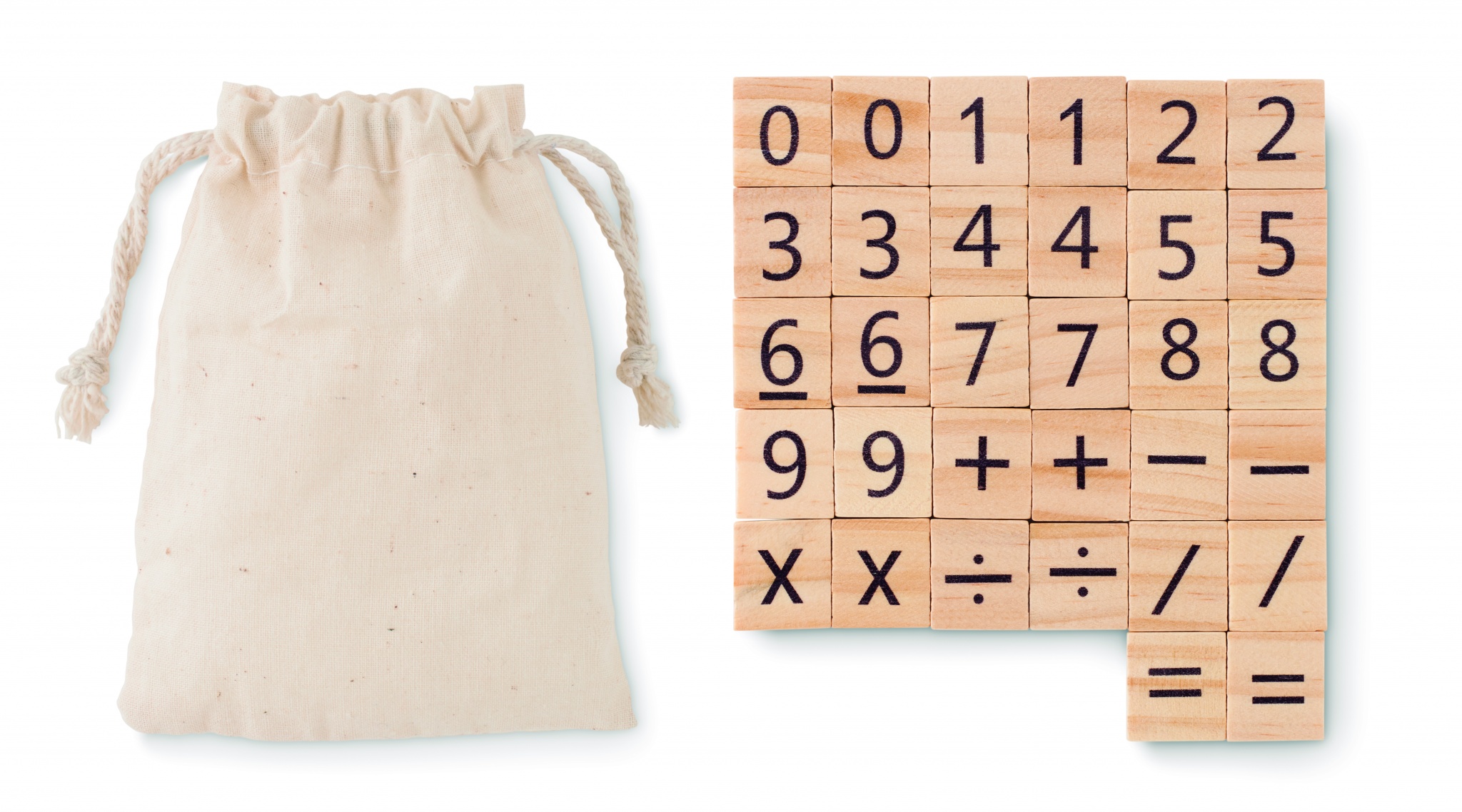 Настольная развивающая игра на счет из дерева в хлопковом мешочке. Включает 32 фигурки.