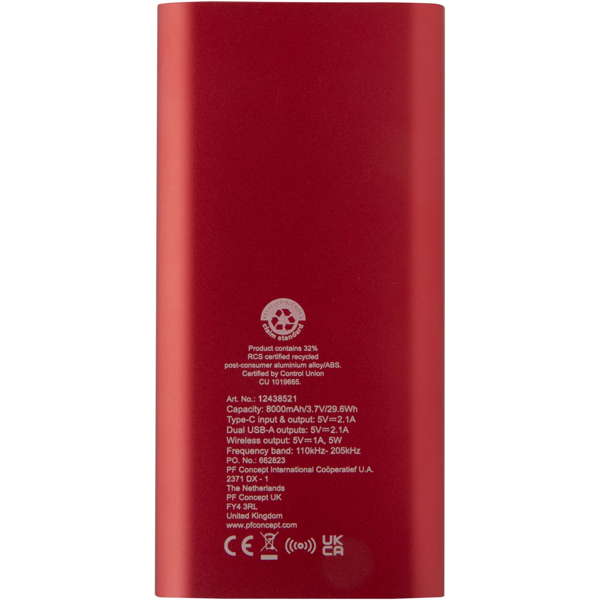 Портативное зарядное устройство с входным/выходным портом Type-C и двумя портами USB-A, что означает, что одновременно можно заряжать 3 устройства. Также поддерживает беспроводную зарядку мощностью 5 Вт для всех устройств с поддержкой Qi. В портативном зарядном устройстве используется литий-полимерный аккумулятор емкостью 8000 мАч, который обеспечивает максимальную выходную мощность 10 Вт. Это портативное зарядное устройство на 28% изготовлено из переработанного пластика, сертифицированного RCS. В комплект поставки входит зарядный кабель TPE Type-C — USB-A.