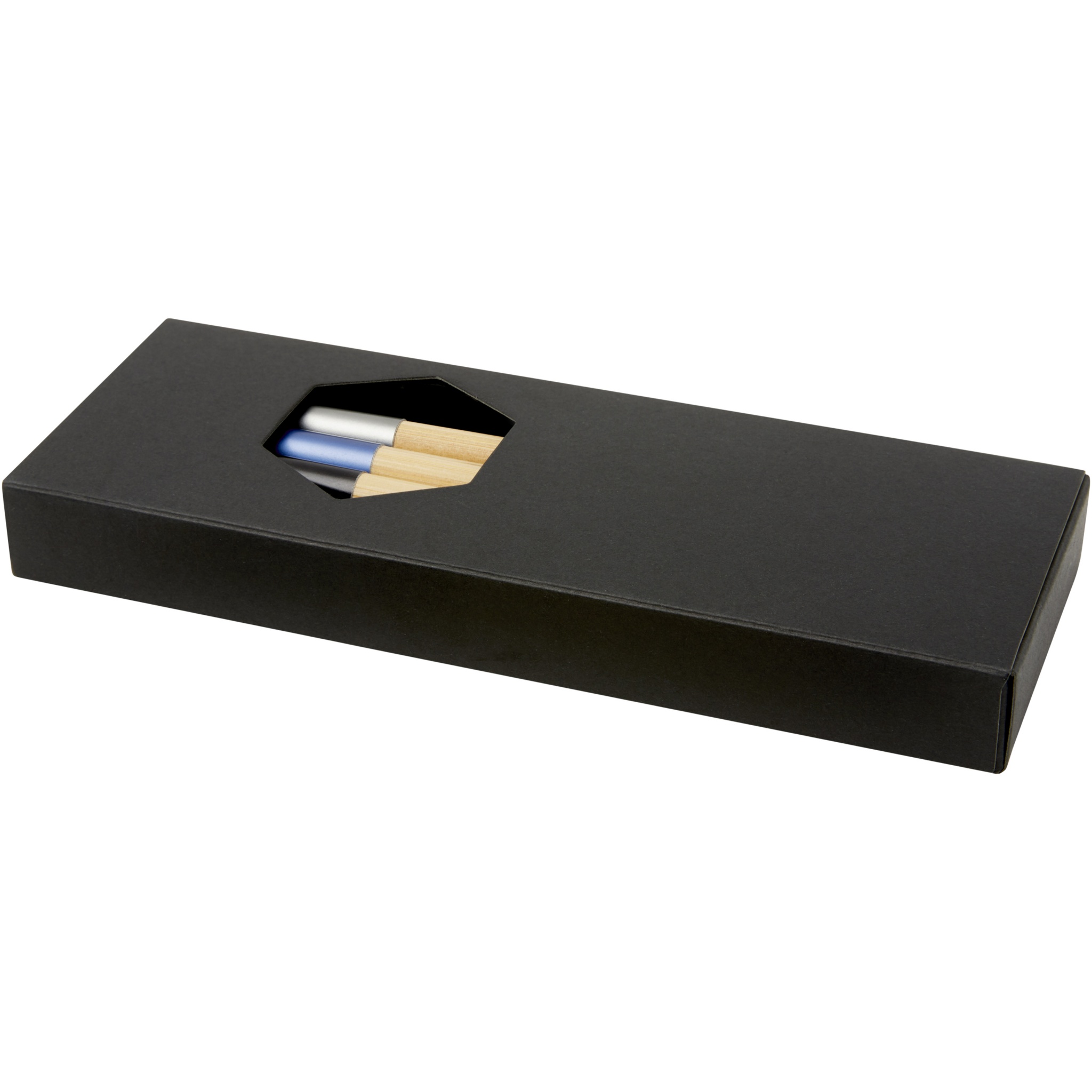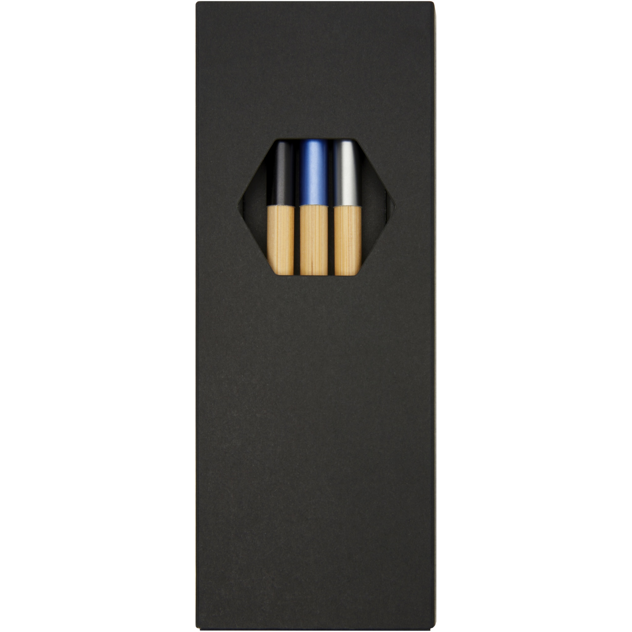 Комплект шариковых ручек с эксклюзивным дизайном, состоящий из трех шариковых ручек с цветовым акцентом. Шариковая ручка с синей алюминиевой пластиной предварительно заполнена синими чернилами, а две другие ручки предварительно заполнены черными чернилами. Упакован в черную подарочную коробку.