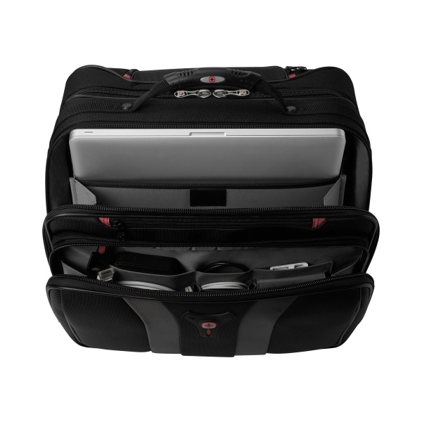 • Отделение для компьютера подходит для большинства ноутбуков 15'/17' • Карман для быстрого доступа к таким вещам, как мобильный телефон, авиабилеты и т. д. • Колеса с легким скольжением облегчают маневрирование в узких проходах и узких углах • Универсальный деловой органайзер имеет карманы и слоты для ручек, КПК, телефона, iPod, визитных карточек, удостоверений личности и многого другого • В просторном ночном отделении поместятся вещи на следующий день, что делает его идеальным для деловых поездок
